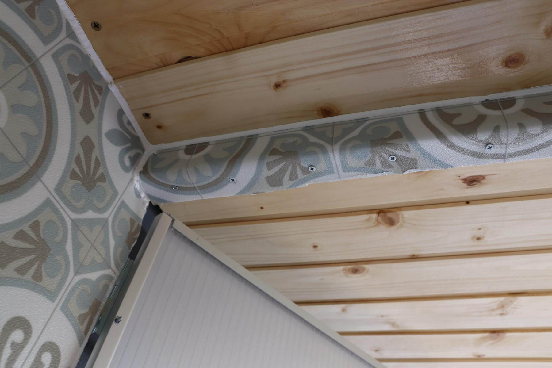 Damit kein blankes Holz in der Dusche übrig bleibt, habe wir noch kleine Stücke von dem PVC zugeschnitten und an der Deckenleiste sowie an der Fußleiste angebracht.