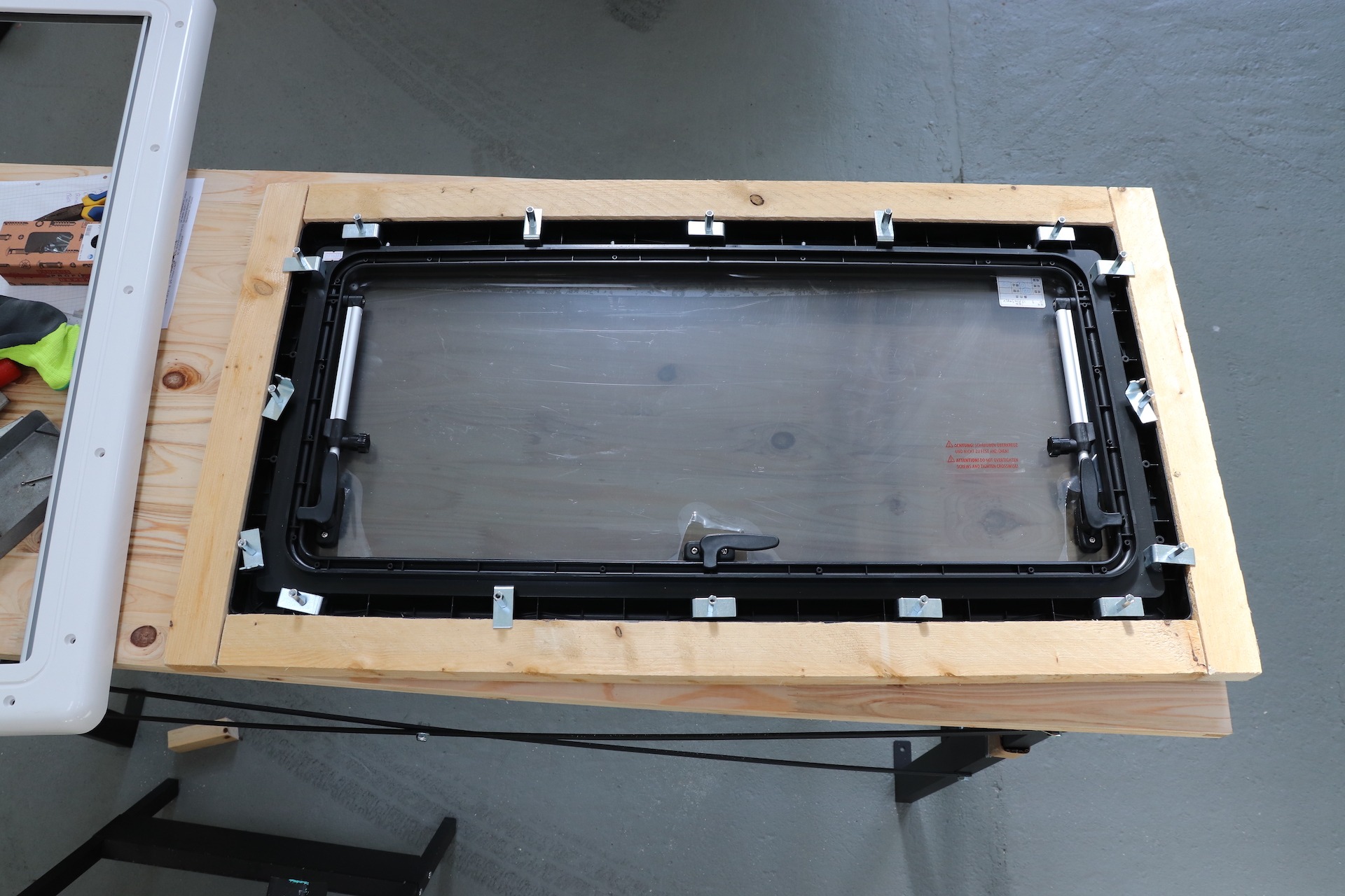 Tobi drückt das Fenster von außen an und ich fange von innen an die mitgelieferten L-Winkelstücke anzuziehen. Diese bewirken, dass sich das Außenfenster gut an den Campervan presst. Zu Beginn immer nur behutsam und über Kreuz anziehen, also zum Beispiel erst oben rechts, dann unten links. So zieht sich das Fenster schön gleichmäßig an das Blech. Man kann förmlich sehen, wie sich das Fenster gegen das Blech drückt. Nach mehrmaligen Anziehen hat das Fenster dann bombenfest gesessen! Anschließend haben wir den weißen Kunststoffrahmen noch angebracht und dann waren wir auch schon fast fertig!