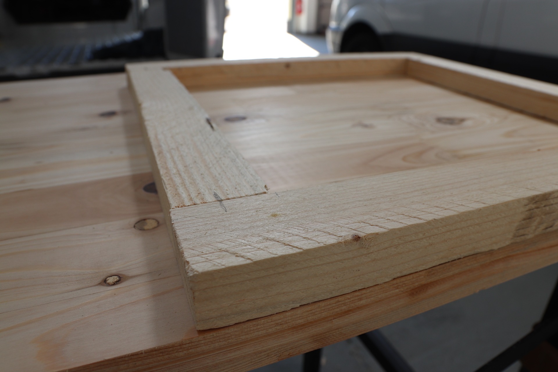 Damit das Carbest Fenster ideal angebracht werden kann, benötigt es eine Wandstärke von 30mm. Diese Dicke ist bei dem dünnen Blech unseres Vans natürlich nicht gegeben, denn diese beträgt nur ca einen Millimeter. Es muss also ein Stützrahmen her, welcher die entsprechende Wandstärke erzeugt und zusätzlich Stabilität bringt. Die Hölzer dienen dazu, die nötige Einbautiefe zu erreichen, welche die Fenster benötigen. Wir haben für unseren Stützrahmen 30mm dicke Holzlatten verwendet (28mm hätten wir bevorzugt, leider gab es sie nicht im Baumarkt). Das wichtigste ist aber, dass man auf die Mindesteinbautiefe von 30mm kommt. Die Holzlatten haben die wir miteinander verschraubt, sodass ein Rahmen entsteht. Der Holzrahmen ist für die geplante Position allerdings zu groß und eckt an den Überständen der Karosserie an und so müssen wir ihn noch etwas anpassen. Wir haben die vier Kanten jeweils abgerundet und die Seiten verschmälert.