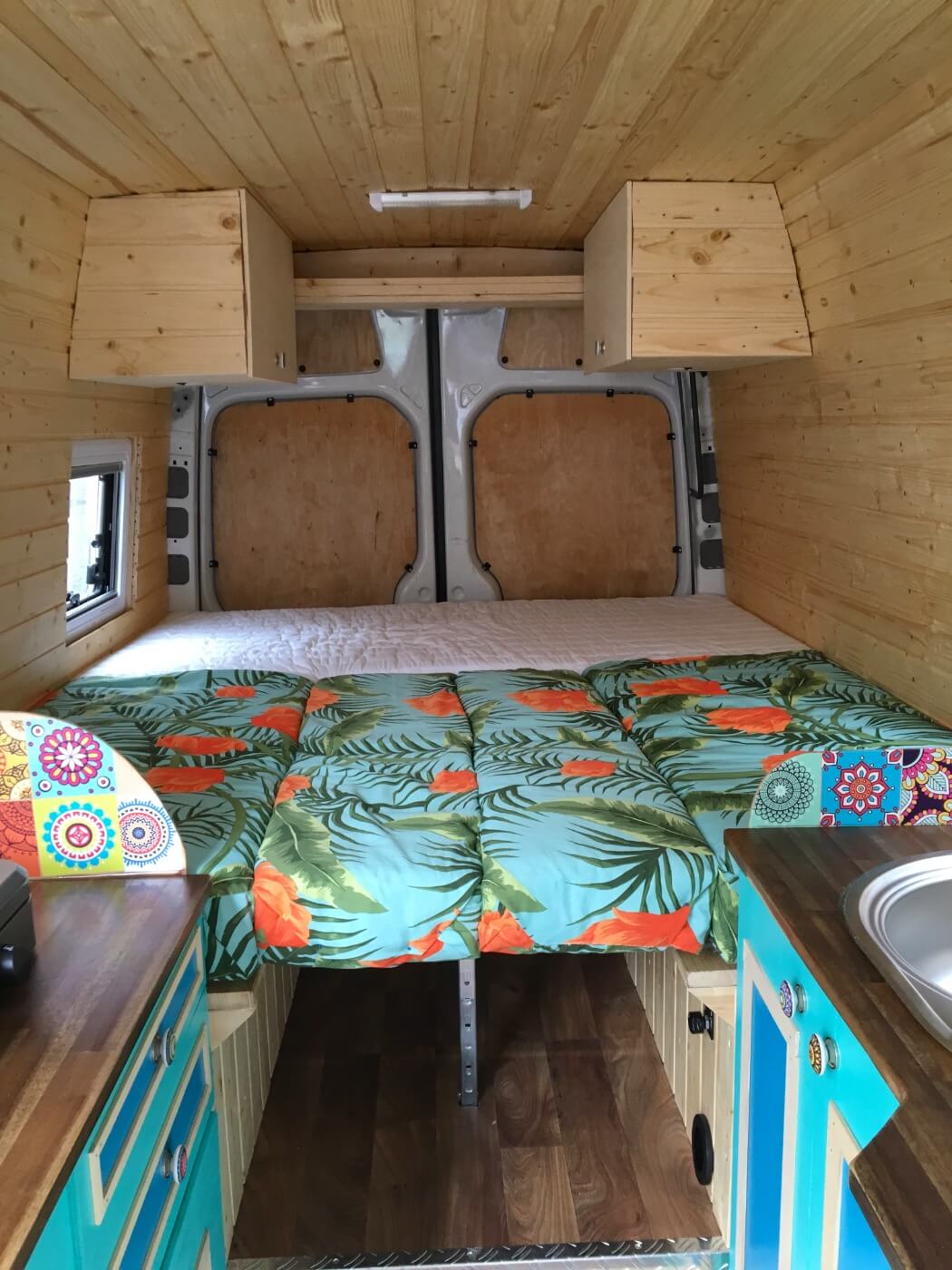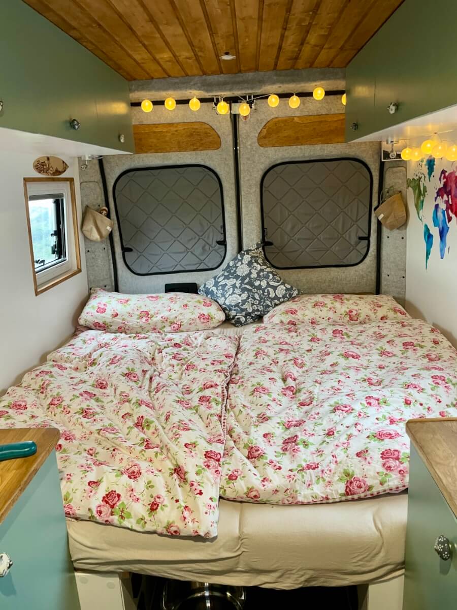 Wir haben die Matratze von unserem Sprinter selber zugeschnitten und anschließend mit Stoff bezogen. Das war wirklich sehr viel Arbeit und durch unser mangeldes Nähtalent wurde das Ergebnis auch nicht allzu gut. 😉 Falls du im Nähen besser bist als wir, kannst du sogar einen Reißverschluss einnähen und dann kann man die Polster auch mal waschen.