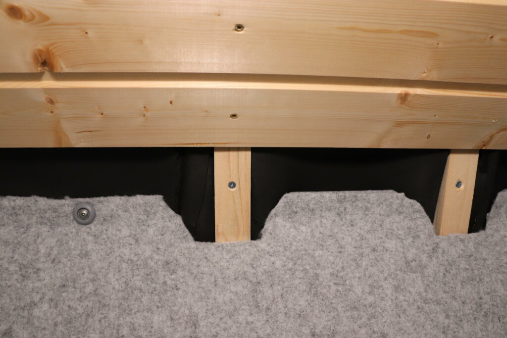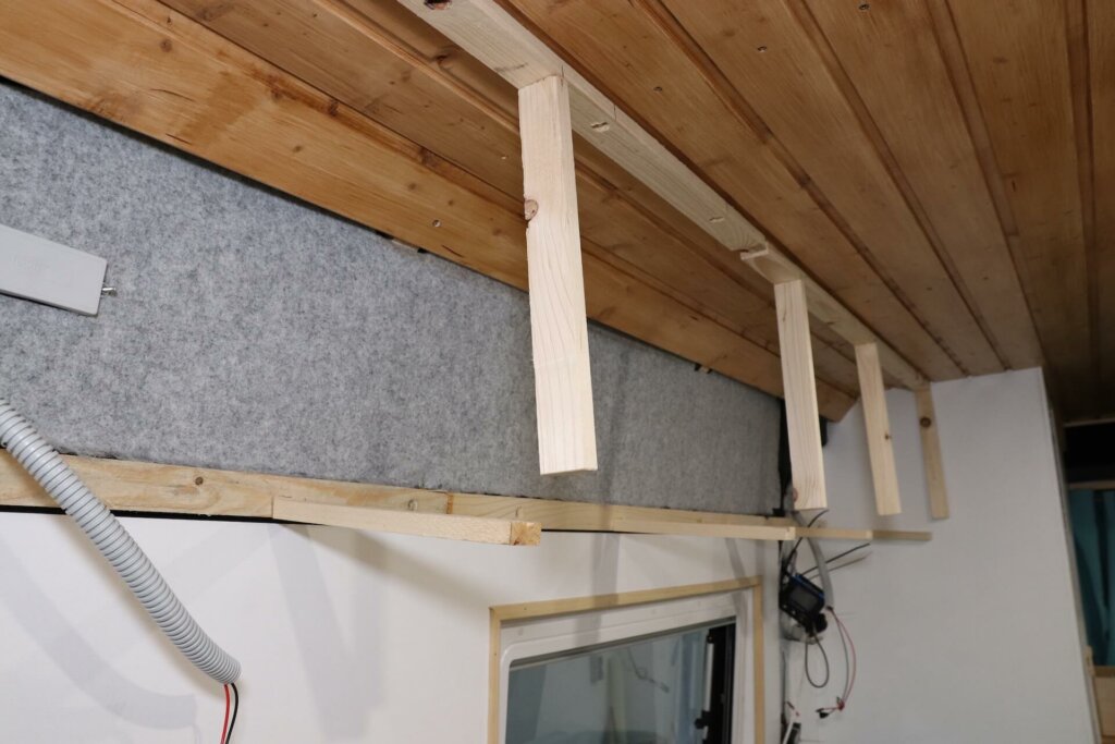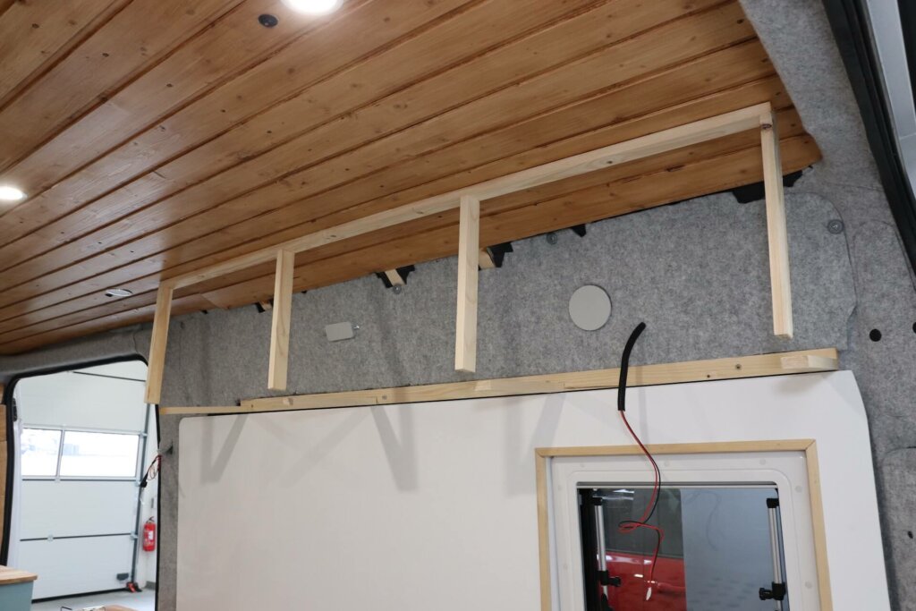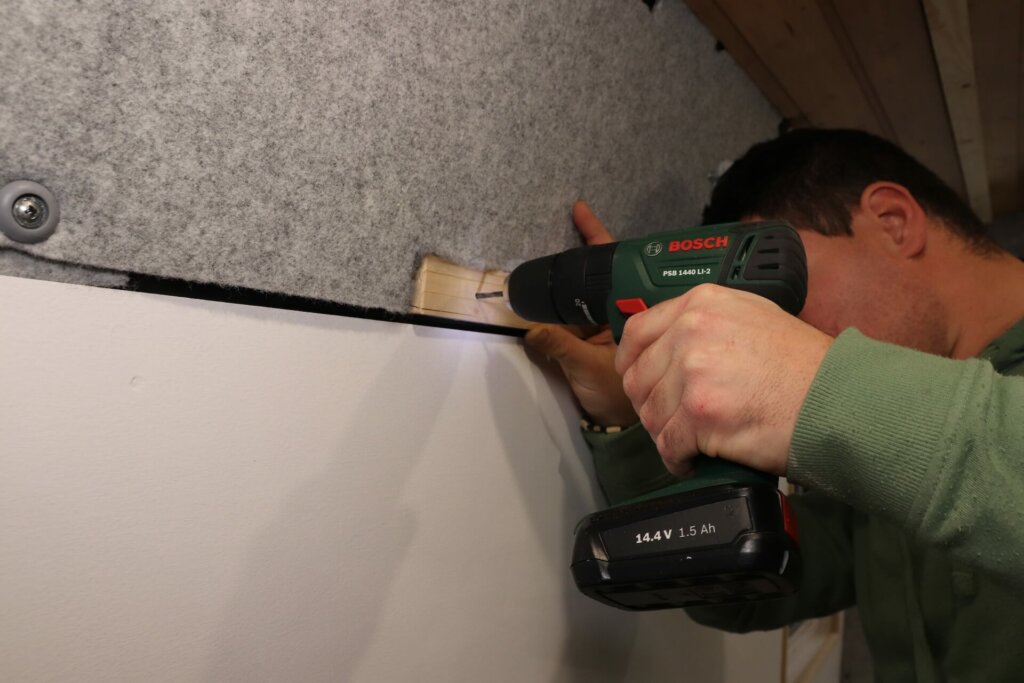 Wir haben pro Schrank insgesamt drei Nietmuttern an der Decke gesetzt und drei weitere in der Seitenwand. Daran befestigen wir nun auf der Deckenverkleidung eine Holzlatte in der entsprechenden Länge, wie lang auch unser Hängeschrank werden soll. Die Holzlatte ist mit der Nietmutter in der Fahrzeugkarosserie befestigt und die Schraube ist so lang, dass sie auch durch das Profilholz und die darunter liegende Unterkonstruktion geht. Die zweite Holzlatte an der Wand auf dem Filz anzubringen ist etwas einfacher, da hier die Konstruktion nicht ganz so dick war wie an der Decke. Die beiden Holzlatten werden nun die Basis für unseren ersten Schrank bilden.