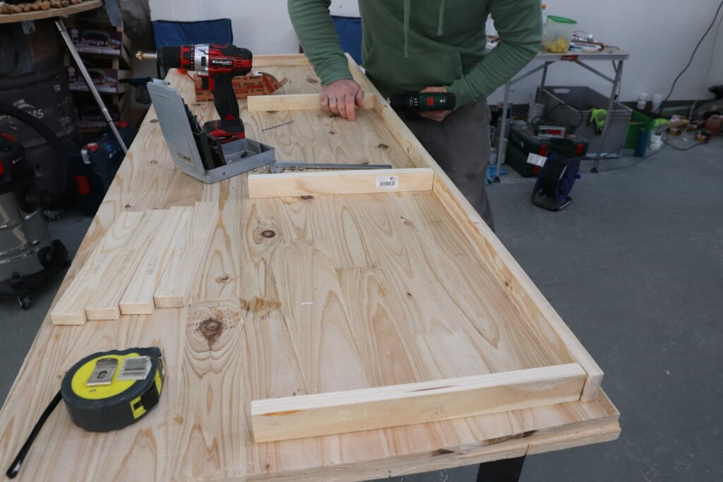 Um die Verbindungen an die obere sowie die seitliche Holzlatte zu schrauben, müssen wir die Holzleisten wieder abnehmen und bauen draußen unser Gerüst soweit zusammen. Anschließend kann das Gerüst der Hängeschränke wieder eingesetzt werden und wir können es vollständig miteinander verschrauben. Hierbei kann man auch Winkel benutzen, aber bei uns wird es auch ohne Winkel gerade und vor allem stabil genug. Bei der Endmontage des Gerüsts haben wir darauf geachtet, dass es rechtwinklig wird, denn bei vielen Vans stehen die Seitenwand und Decke nicht im rechten Winkel zueinander. Da ist schon etwas Geschick gefragt, so dass der Schrank am Ende auch gerade im Raum steht.