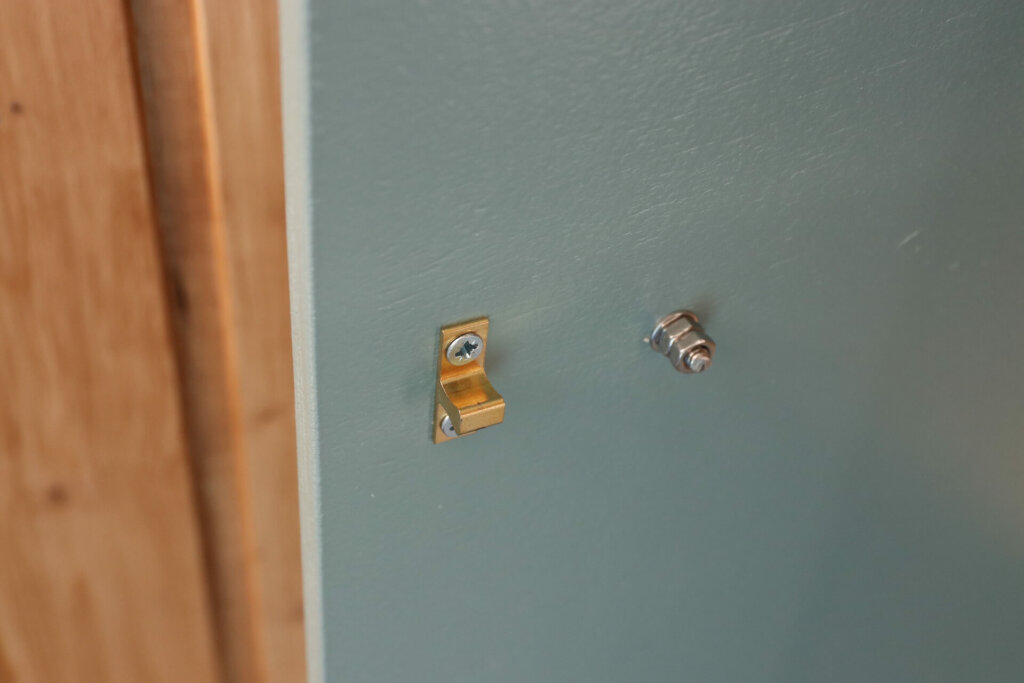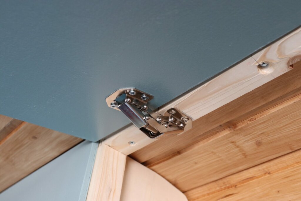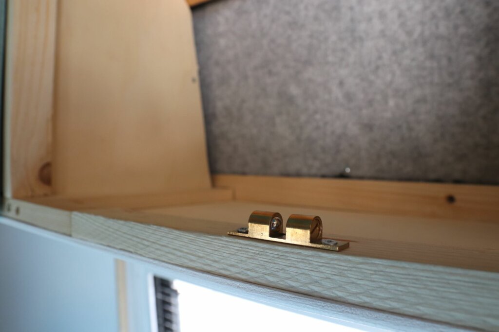 Dazu haben wir uns spezielle Möbelschrauben bestellt, welche nur 10 mm lang sind. Im Baumarkt waren die kürzesten Schrauben 13 mm lang, so dass sie hinten aus der Holzplatte herausragen würden. Nach ein wenig Anpassung sitzen die Schranktüren dann auch gerade und lassen sich gut öffnen und schließen. Die Aufschraubscharniere sind recht stark, weswegen die geöfneten Schranktüren auch oben bleiben. So kann man einfach Klamotten rein- und rausholen und benötigt keine zusätzlichen Halterung. Damit die Türen während der Fahrt geschlossen bleiben haben wir sie mit Kugelschnappern* fixiert. Nun fehlen nur noch die Möbelknöpfe und unsere Hängeschränke sind auch bald schon fertig!