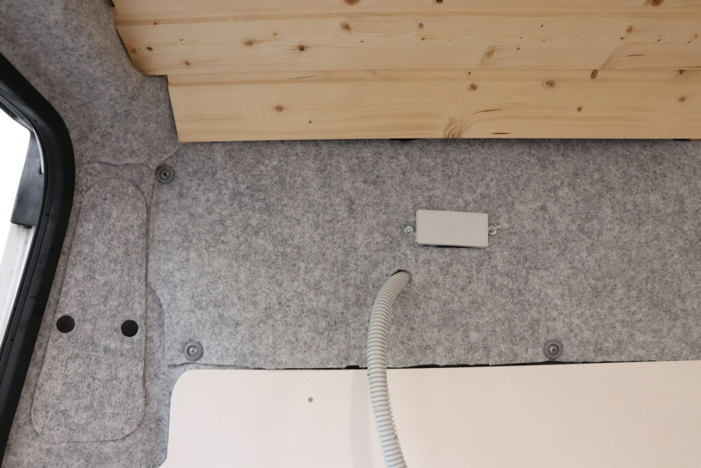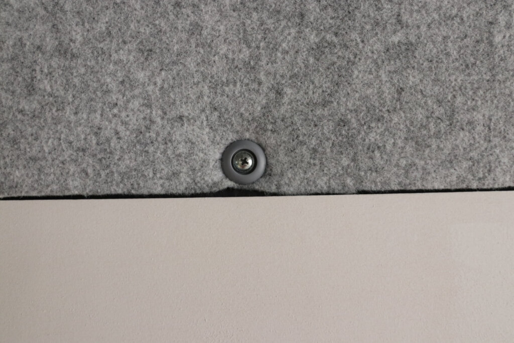 Die Rückwand unserer Hängeschränke wird aus einer mit Filz* bezogenen PVC-Platte bestehen. Eine Verkleidung aus Holz würde eventuell Stauraum wegnehmen, geht nur unnötig ins Gewicht und man sieht sie sowieso nur wenn man den Schrank aufmacht. Da wir noch genug Filz übrig haben und das reine Armaflex auch nicht ganz so schön finden, schneiden wir die originale Plastikverkleidung des Ducatos auf unser Maß zu, beziehen diese mit Filz und bringen sie anschließend wieder an der Fahrzeugwand in seiner ursprünglichen Position an.