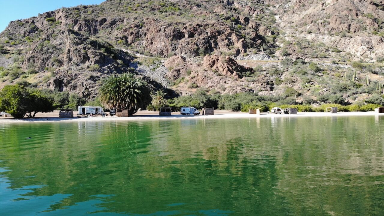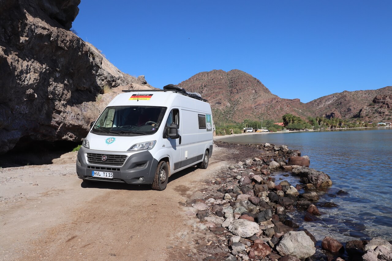 Am Nachbarstrand sammeln wir viele schöne Muscheln und am nächsten Tag fahren wir zum noch schöneren Playa El Coyote. Die Zufahrt ist etwas abenteuerlich, der Weg führt direkt an der Bucht über einige kleine Steine und da gerade Flut ist kommt sogar etwas Wasser über die Straße. Der Strand selber ist wunderschön und in der einen Ecke haben sich viele amerikanische ‚Snowbirds‘ angesiedelt.