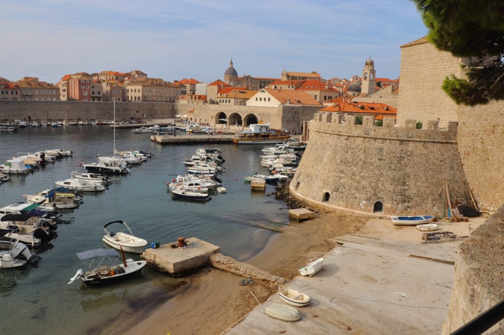 Anschließend geht es für uns weiter nach Dubrovnik. Dubrovnik ist eine mittelalterliche Stadt, die von einer großen Festung erhalten ist. Da die Campingplätze hier mit ca 70€ sehr teuer sind, schlafen wir auf einem Parkplatz in der Stadt. Hier kann man für 24 Stunden bezahlt parken und auch das Übernachten im Camper ist kein Problem. Zum Glück haben wir in unserem Van ja alles dabei was wir brauchen. Von dem Parkplatz sind wir innerhalb von 20 Minuten in der historischen Altstadt von Dubrovnik, die seit 1979 zum Weltkulturerbe der UNESCO gehört. Von der Festung Lovrijenac hat man eine tolle und kostenlose Aussicht auf die Altstadt mit den Festungsmauern.