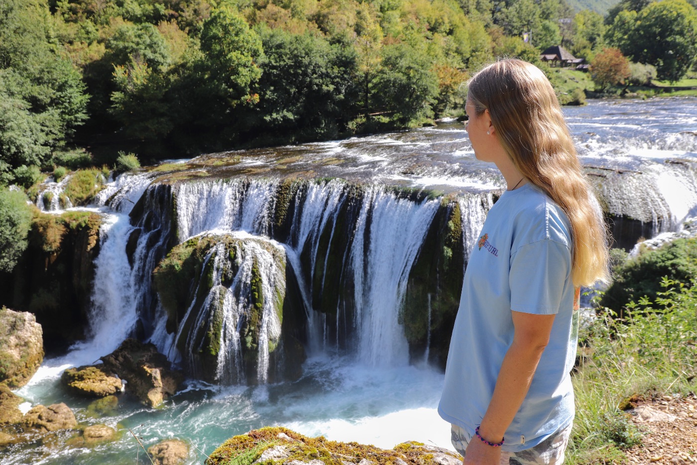 Von dem Nationalpark Plitvicer Seen beschließen wir weiter durch das kroatische Inland zu fahren, Richtung der Grenze zu Bosnien. Unser nächster Stopp auf unserem Kroatien Roadtrip mit dem Camper ist der Una Nationalpark. Dieser befindet sich in Bosnien und Herzegowina und liegt zur anderen Hälfte in Kroatien und ist noch ein richtiger Geheimtipp. Unser Hauptziel ist der Štrbački Buk Wasserfall, welcher sich halb in Kroatien und halb in Bosnien und Herzegowina befindet. Die Ladesgrenze verläuft direkt durch den Fluss und auf beiden Seiten gibt es einen View Point mit toller Aussicht auf den Wasserfall. Wir entscheiden uns auf der kroatischen Seite zu bleiben. So sparen wir uns den Grenzübergang und dazu ist die kroatische Seite bis jetzt auch nur wenig ausgebaut. Wir sind komplett alleine un außer uns ist niemand hier. Auf der bosnischen Seite sind auch nur wenige Leute da. Eintritt kostet der Wasserfall auf der kroatischen Seite übrigens nicht.