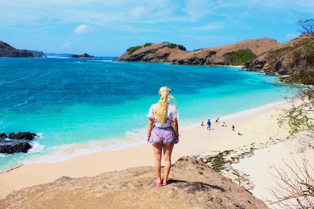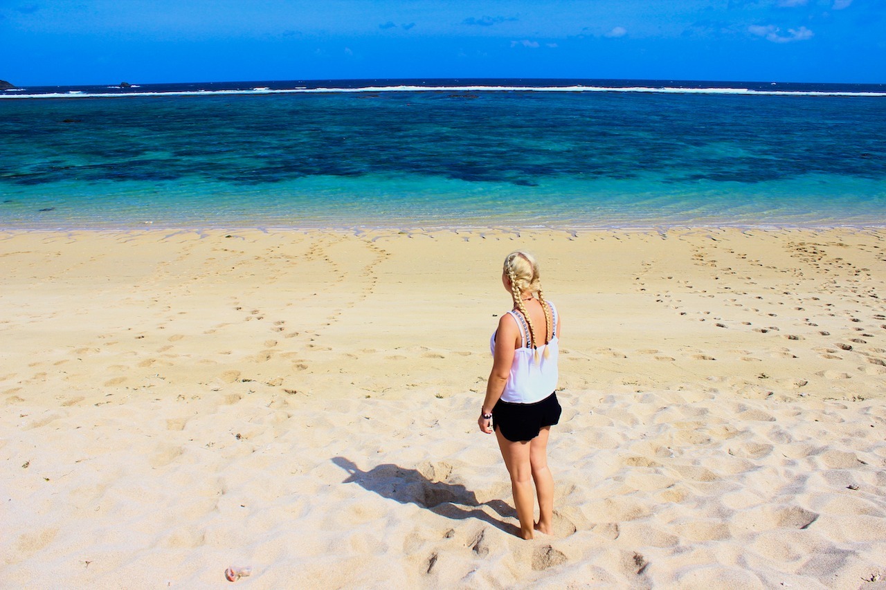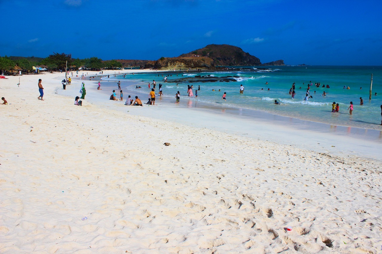 Für den nächsten Tag haben wir uns einen Roller gemietet und möchten die Strände erkunden. Der Süden Lombok’s ist bekannt für traumhafte Buchten mit weißem Sandstrand. Zuerst fahren wir an den Tanjung Aan Beach, dem bekanntesten Strand auf Lombok. Bei der Ankunft sind wir erst einmal geschockt von den ganzen Menschenmassen. Wir dachten auf Lombok ist nicht viel los?! Tatsächlich sind es zu 90% Einheimische am Strand. Es ist die Zeit nach Ramadan und viele Indosesier in den Urlaub fahren. Ein paar indonesische Mädchen wollen ein Foto mit mir machen. Mit meinen blonden Haaren falle ich zugegebenermaßen doch sehr auf! 😀