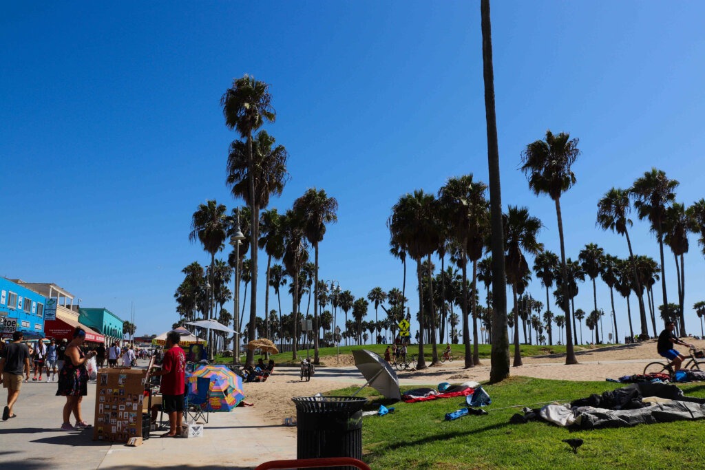 Vom Malibu Beach sind wir zu dem Venice Beach gefahren, wo wir in einer Seitenstraße kostenlos geparkt haben. Der Venice Beach ist mit dem Santa Monica Pier durch einen schönen Fahrradweg verbunden. Durch Palmen fahren wir vorbei an Künstlern, Obdachlosen und den schönen Lifeguard Häuschen.