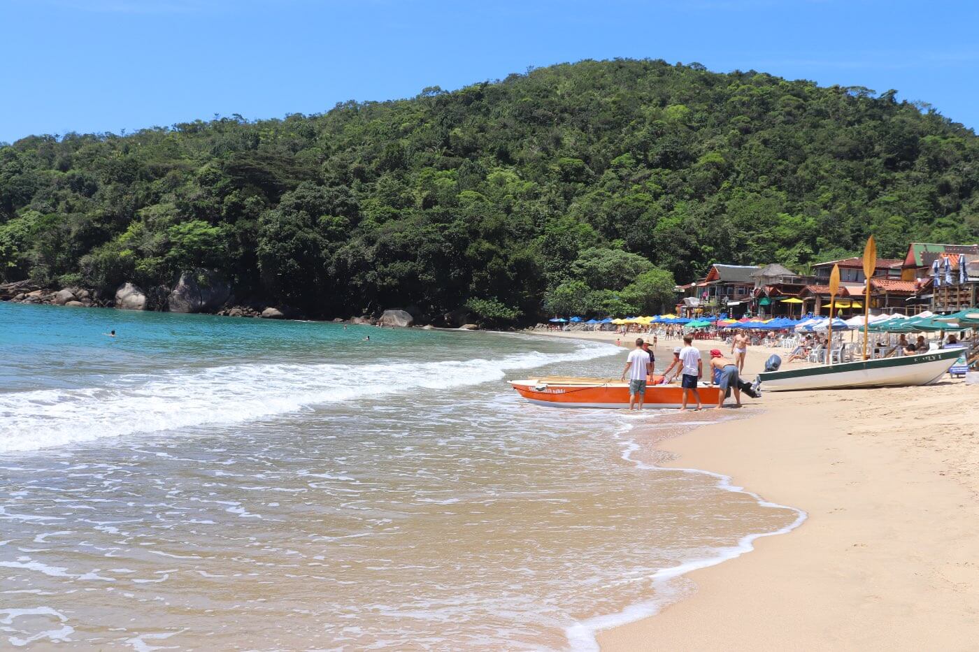 Kaum sind wir da und haben unser Gepäck ausgeladen, organisieren die freundlichen Besitzer auch schon das Boot auf die Insel für uns und ehe wir uns versitzen, laufen wir auch schon die zwei Minuten runter zum Steg, haben unser Ticket in der Hand und es geht los. Eigentlich hatten wir geplant das nächste Boot zu nehmen, aber da das letzte scheinbar etwas verspätet war, ging es nun doch ganz schnell. Nach nur 20 Minuten Bootsfahrt erreichen wir die Insel und gehen zu Fuß zu unserer Unterkunft in dem Hauptort Abrao. Die Ilha Grande ist autofrei und wir fühlen uns hier direkt wie im Urlaub.