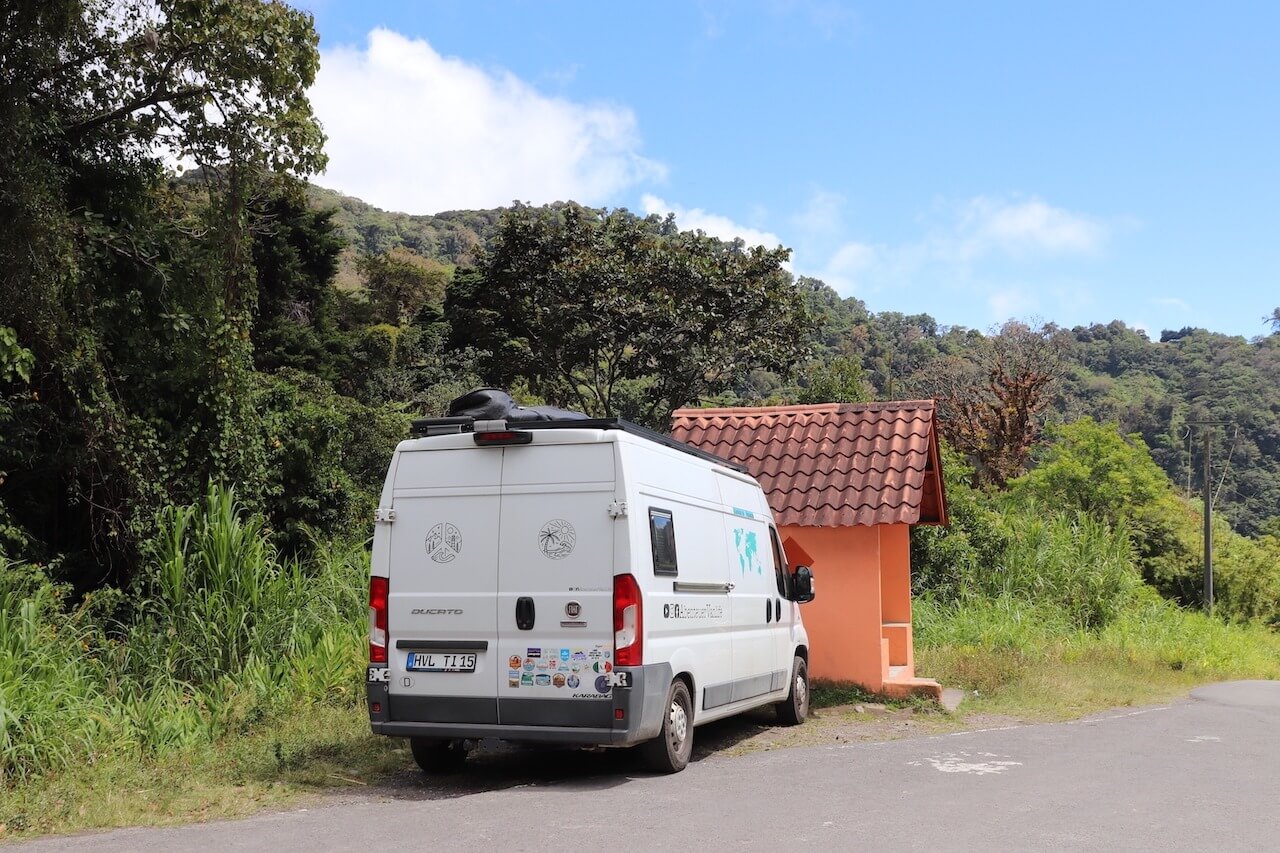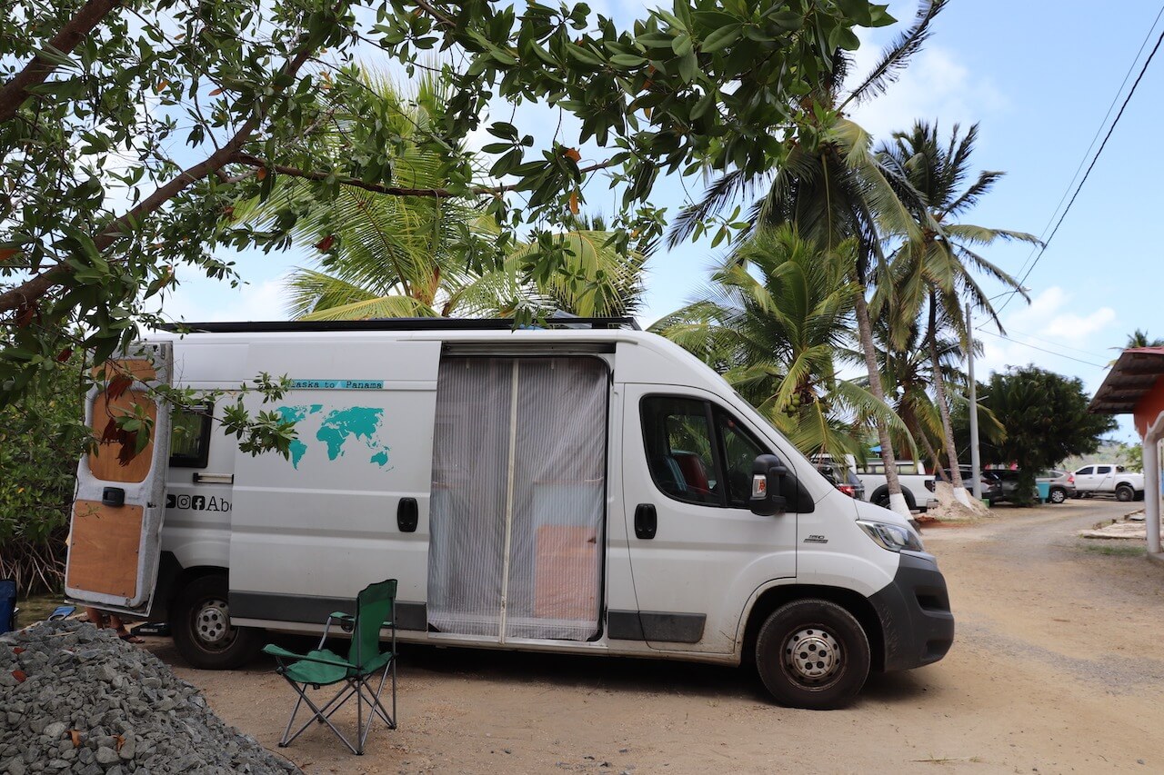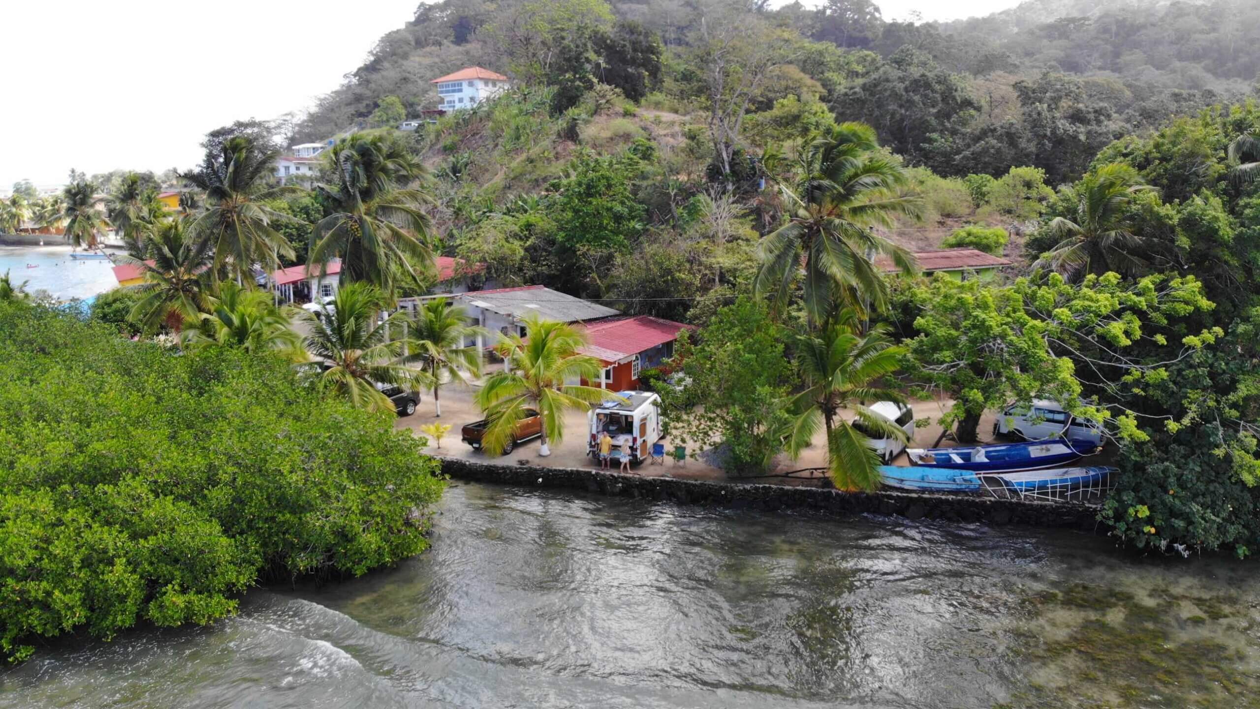 Nach einigen Tagen in Panama City haben wir alles für die Verschiffung vorbereitet und bis zu dem geplanten Abgabetermin am Hafen in Colon haben wir noch einige Tage Zeit. Die möchten wir nicht in der Großstadt verbringen und lieber noch etwas erleben. Also fahren wir nach Colon und von dort die kleine Küstenstraße entlang. Wir landen in dem Ort La Guaira, wo wir bei einem kleinen Hotel fragen, ob wir dort mit unserem van übernachten dürfen. Den Platz haben wir natürlich wie immer in iOverlander gefunden. Wir parken unseren Van direkt am Meer und haben von hier (abgesehen von dem Kieshaufen neben uns) einen perfekten Blick auf das Wasser. Außerdem ist es hier an der Karibikküste zumindest auch ein bisschen kühler. Die Besitzer sind super nett und wie immer sind wir die einzigen Overlander hier.