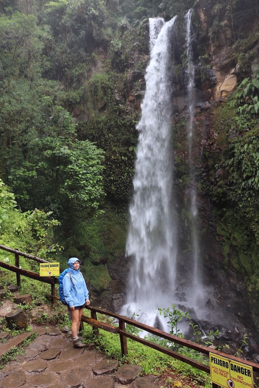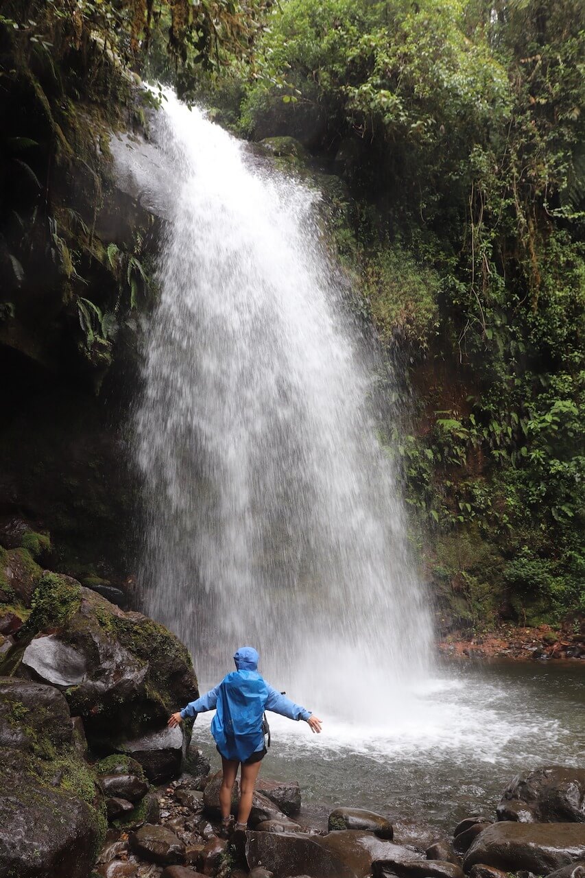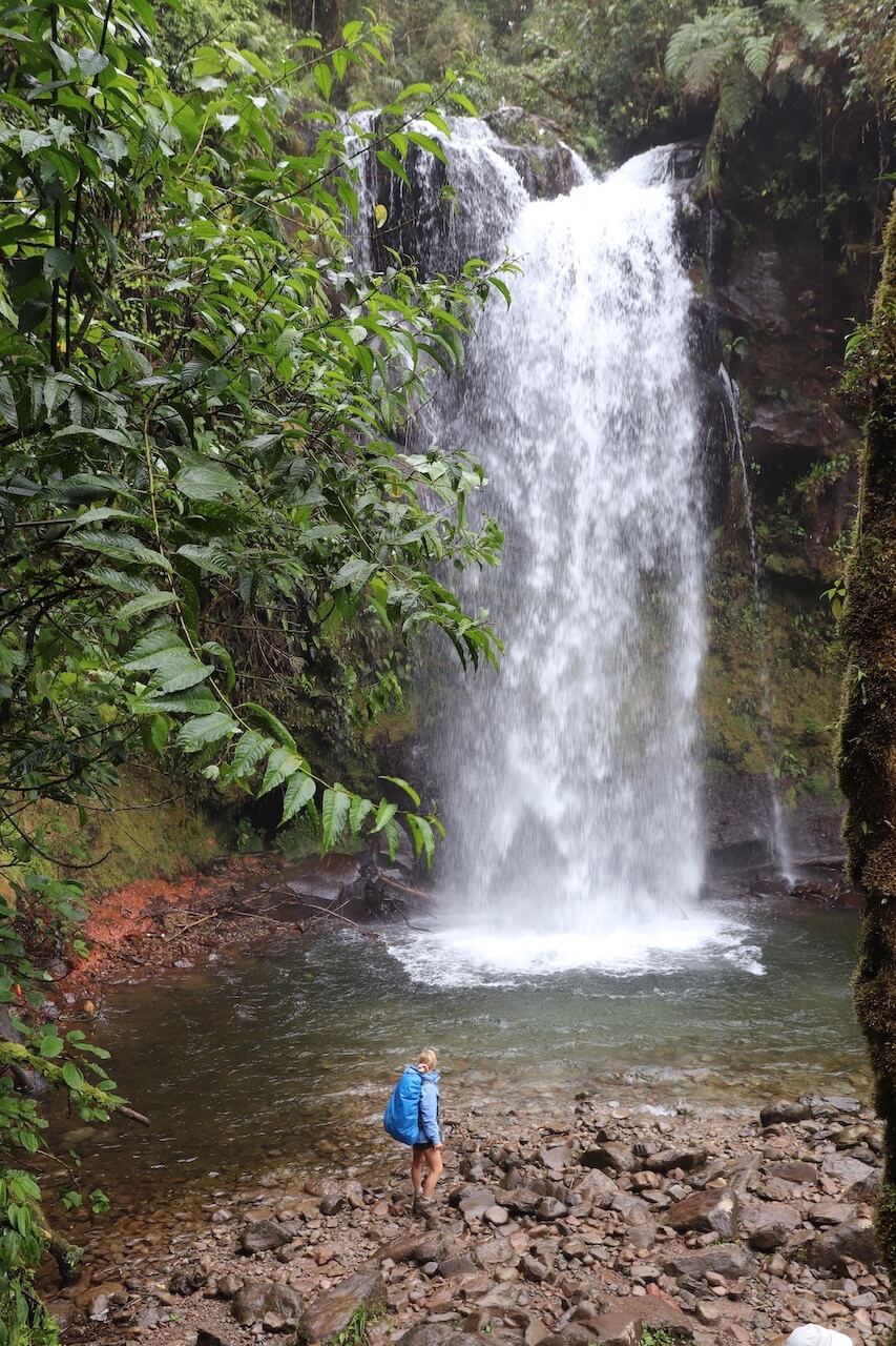 Der Startpunkt der Wanderung liegt auf 1630 Meter Höhe und hier sind es nochmal einige Grad kühler als in Boquete. Nach einigen Minuten kommen wir bei einem Grundstück vorbei und bezahlen 10$ Eintritt pro Person. Es nieselt und wir gehen weiter durch den Regenwald, bald erreichen wir auch schon den ersten Wasserfall. Auch der zweite Wasserfall ist wirklich paradiesisch schön! Wäre es wärmer könnte man hier problemlos schwimmen gehen, die Kulisse ist wirklich toll. Danach führt der Weg steil bergauf, wir klettern über große Wurzeln und bleiben gefühlt immer wieder im Matsch stecken oder rutschen aus.