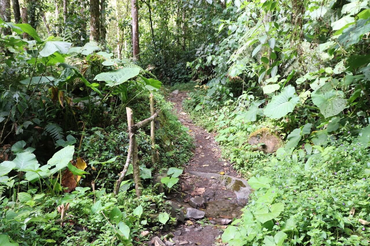 In der Umgebung von Boqute gibt es einige schön angelegte Wanderwege durch die Berge und Wälder. Eine kleine Straße führt uns durch die Wiesen und Felder und wir nähern uns der Bergkette. Von hier startet die Lost Waterfall Wanderung durch den Hochland-Regenwald.
