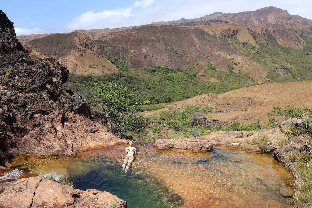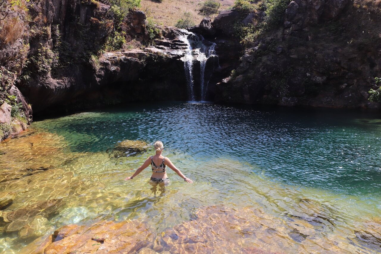 Der Wasserfall selber ist zum Glück von dem Wind geschützt und kommt uns wie eine kleine Oase vor. Das Wasser ist strahlend blau und herrlich erfrischen. Unter dem Wasserfall haben sich einige natürliche Pools gebildet.