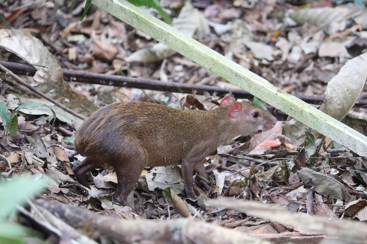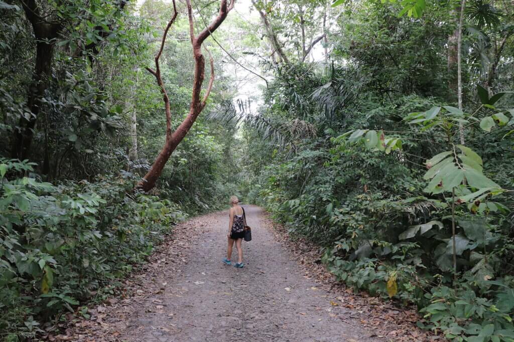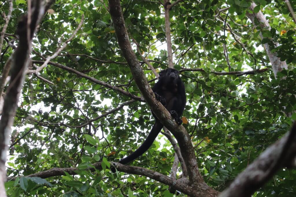 Die sogenannte Pipeline Road führt einmal 17.5 Kilometer durch den Regenwald. Wir möchten einen kleinen Teil davon erkunden und gehen einfach mal los. Schon nach kurzer Zeit sehen wir einen Aguti im Gebüsch, ein meerschweinchen-ähnliches Nagetier. Dann hören wir über uns in den Bäumen Geraschel und entdecken eine Herde Kapuzineraffen und kurz darauf sehen wir noch Brüllaffen, wie schön!