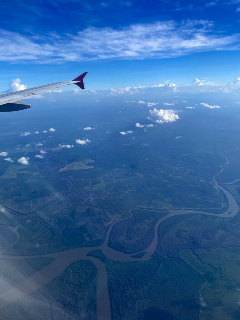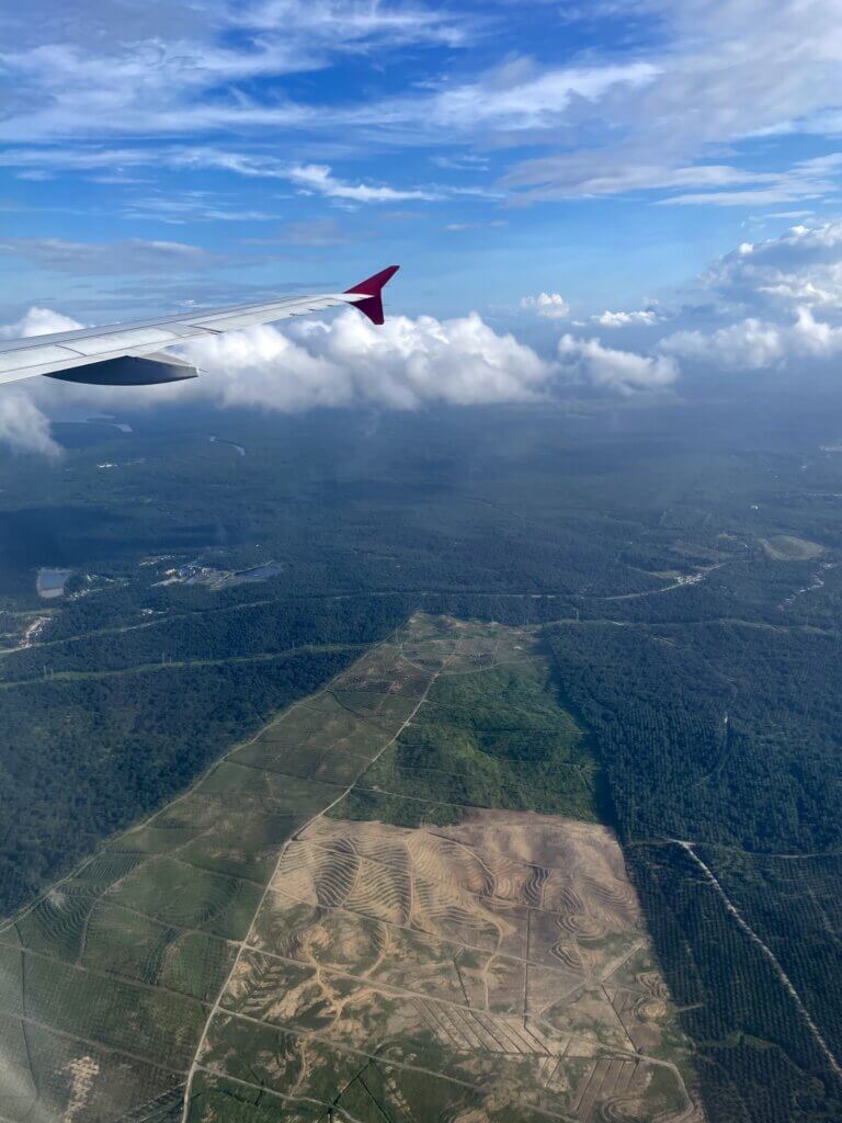 Mit Air Asia fliegen wir von Kuala Lumpur nach Sandakan. Bei der Gepäckaufgabe haben wir allerdings Probleme, da beide aufgegebenen Gepäckstücke gleich schwer sein müssen. Mein großer Rucksack wiegt 15 Kilo und Tobis Koffer wiegt 24 Kilo. Da wir das bezahlte Gewicht aber nicht zwischen uns aufteilen dürfen müssen wir alles umpacken. Zum Glück sind wir früh genug am Flughafen und haben noch genug Zeit, sonst wäre es ziemlich stressig geworden. Auf dem Flug kommen wir an traumhaften Inseln und Regenwäldern vorbei und große braune Flüsse schlängeln sich durch die Landschaft. Die Regenwälder verwandeln sich in endllose Palmölplantagen und wir sehen sogar gerrodete Flächen, wo scheinbar neune Plantagen entstehen.