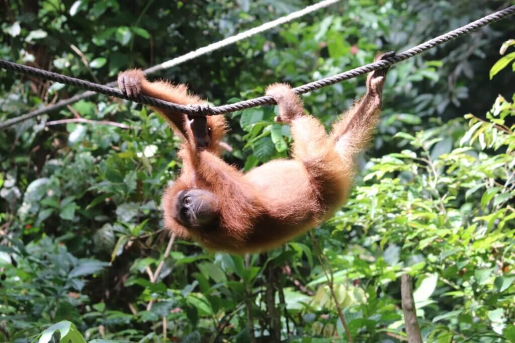 Das Ticket für das Rehabilitation Center ist den ganzen Tag gültig und so gehen wir am nächsten Morgen nach dem Frühstück von unserer Unterkunft zu der ersten Fütterung. Wir müssen den Rucksack abgeben und auch Wasserflasche und Kameratasche können wir nicht reinnehmen, da manche Orang Utans den Besuchern sonst die Sachen entwenden werden. Ein kleiner Boardwalk führt durch den Regenwald und schon nach einigen Metern entdecken wir hoch über uns einen Orang Utan in den Bäumen. Wir haben gar nicht damit gerechnet so schnell einen zu sehen und freuen uns riesig.
