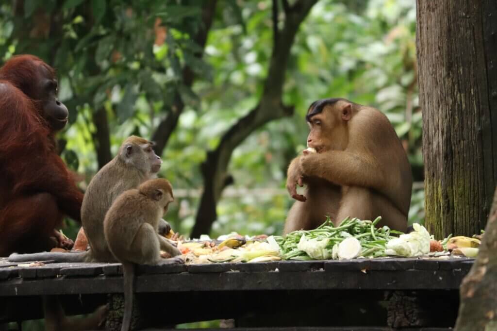 Danach gehen wir zu der Aussichtsplattform, wo schon zwei Orang Utans Weibchen mit ihren Kleinen in den Bäumen sitzen und auf die Fütterung warten. Die Plattform liegt im Freien und wir haben eine guten Blick auf die Orang Utans. Auch andere Affen kommen zu der Fütterung und freuen sich über das frische Obst. Insgesamt kommen sechs Orang Utans zu der ersten Fütterung.