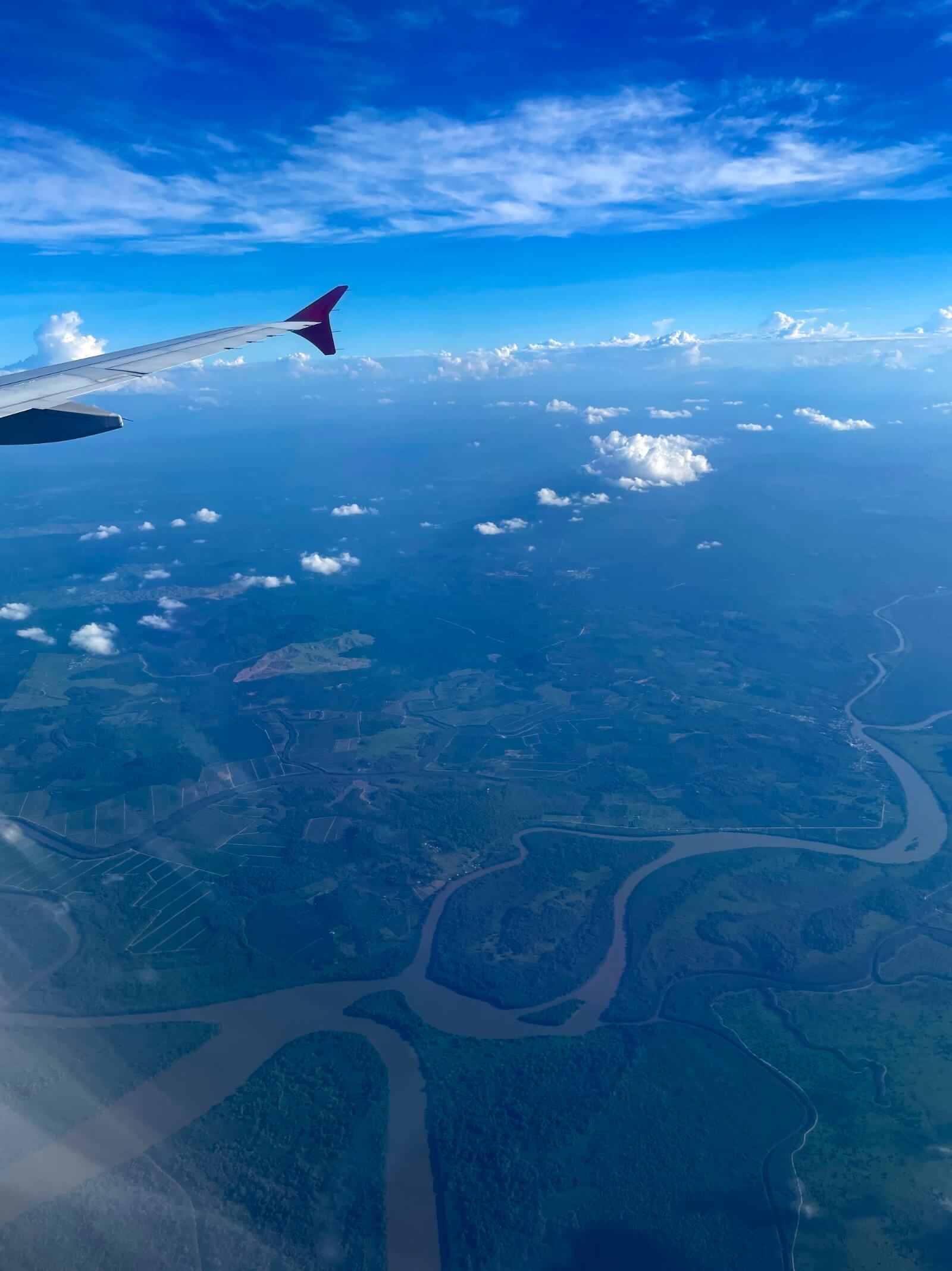 Mit Air Asia fliegen wir von Kuala Lumpur nach Sandakan. Bei der Gepäckaufgabe haben wir allerdings Probleme, da beide aufgegebenen Gepäckstücke gleich schwer sein müssen. Mein großer Rucksack wiegt 15 Kilo und Tobis Koffer wiegt 24 Kilo. Da wir das bezahlte Gewicht aber nicht zwischen uns aufteilen dürfen müssen wir alles umpacken. Zum Glück sind wir früh genug am Flughafen und haben noch genug Zeit, sonst wäre es ziemlich stressig geworden. Auf dem Flug kommen wir an traumhaften Inseln und Regenwäldern vorbei und große braune Flüsse schlängeln sich durch die Landschaft. Die Regenwälder verwandeln sich in endllose Palmölplantagen und wir sehen sogar gerrodete Flächen, wo scheinbar neune Plantagen entstehen.