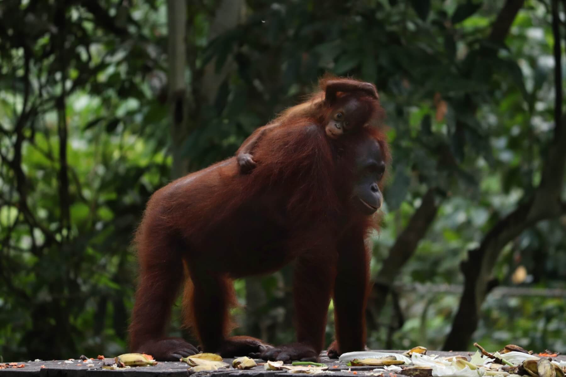 Danach gehen wir zu der Aussichtsplattform, wo schon zwei Orang Utans Weibchen mit ihren Kleinen in den Bäumen sitzen und auf die Fütterung warten. Die Plattform liegt im Freien und wir haben eine guten Blick auf die Orang Utans. Auch andere Affen kommen zu der Fütterung und freuen sich über das frische Obst. Insgesamt kommen sechs Orang Utans zu der ersten Fütterung.