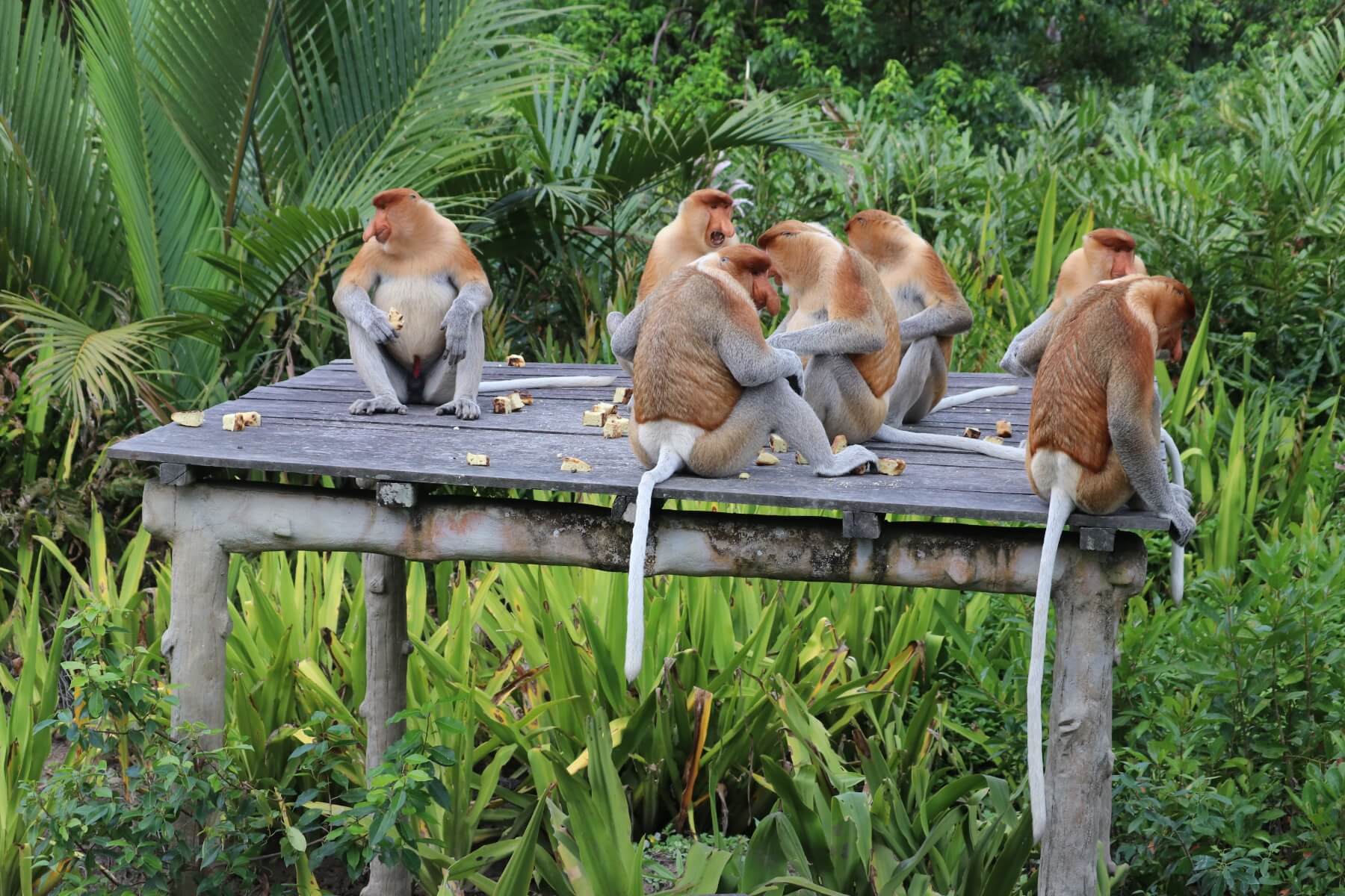 Wir gehen auf einen Boardwalk durch Mangrovenwald und kommen nach einigen Minuten bei der Fütterungsplattform an, wo schon ein Nasenaffe auf dem Baum sitzt und wartet. Nach und nach kommen immer mehr Nasenaffen und warten auf die Fütterung, die kurze Zeit später stattfindet. Es gibt zuckerfreie Pfannkuchen und nicht wie wir erwartet haben Obst und Gemüse. Der Angestellte erklärt uns, dass Nasenaffen vor allem Blätter und Insekten essen und viele Obstsorten nicht mögen und auch nicht vertragen. Es ist schön die Nasenaffen so nah sehen zu können, aber ein bisschen seltsam ist der Anblick schon, wie sie da sitzen und die zuckerfreien Pfannkuchen essen. Übrigens haben nur die Männchen diese markante Nase.