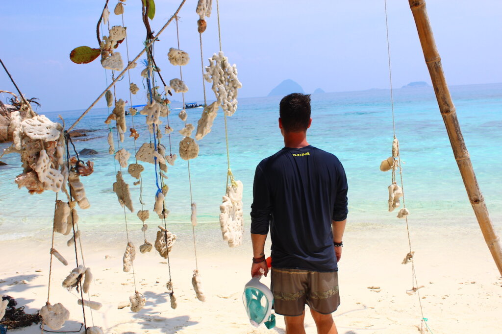 An vielen Stränden findet man diese wunderschönen Dekorationen aus Muscheln und Korallenstücken. Insgesamt habe wir an vier Buchten gehalten. Welcher Strand welcher war, wissen wir leider nicht, da an den Stränden kein Schild war und viele s in Google Maps nicht benannt. Schön sind die Strände aber alle und auch die Entfernung von einem Strand zum nächsten ist nicht groß.Wir sind auf jeden Fall bis an die nördliche Spitze auf der Westseite von Perhentian Kecil gefahren.