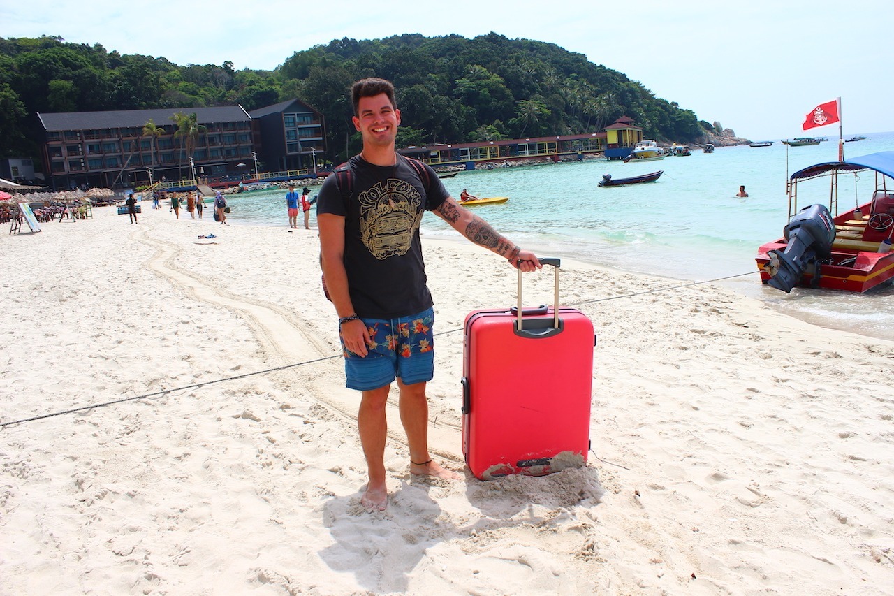Von Kota Bahru sind wir mit einem Taxi nach Kuala Besut gefahren. Hier fahren die Boote los zu den beiden Inseln. Der Preis für das Speedboat beträgt pro Weg 35 Ringgit, hinzu kommt noch eine Nationalparkgebühr von 30 Ringgit. Wir hatten mal wieder Glück und kaum waren wir bei dem Jetty angekommen und hatten unser Ticket, ging es nach zehn Minuten Wartezeit auch schon los. Wir haben uns genau wie letztes Jahr an dem Long Beach auf Perhentian Kecil absetzen lassen. Auf Perhentian Kecil sind die günstigsten Unterkünfte. Wir wollten das Matahari Chalet ansteuern, indem wir schon letztes jahr übernachtet haben. So ging es vom Bootsanleger den Strand entlang zu dem Hotel. Koffer und Rucksack haben sich das Rennen geliefert: der Rucksack hat gewonnen! Tobi war ganz schön fertig mit dem schweren Koffer. 😉 Aber irgendwie müssen wir ja unser ganzes Gepäck, was sich in zwei Jahren in Australien und einem Jahr Neuseeland angesammelt hat, nach Hause kriegen.
