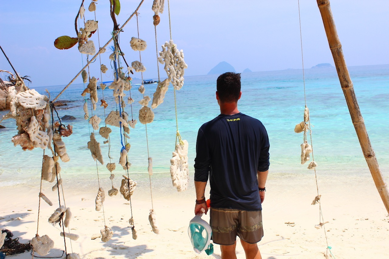 Die Perhentian Islands sind mit Regenwald bewachsen, einige Dschungelpfade überqueren die Inseln. Direkt am Strand fängt der Regenwald an. Die Korallen konnten wir von dem Kajak aussehen, das Wasser ist richtig klar.