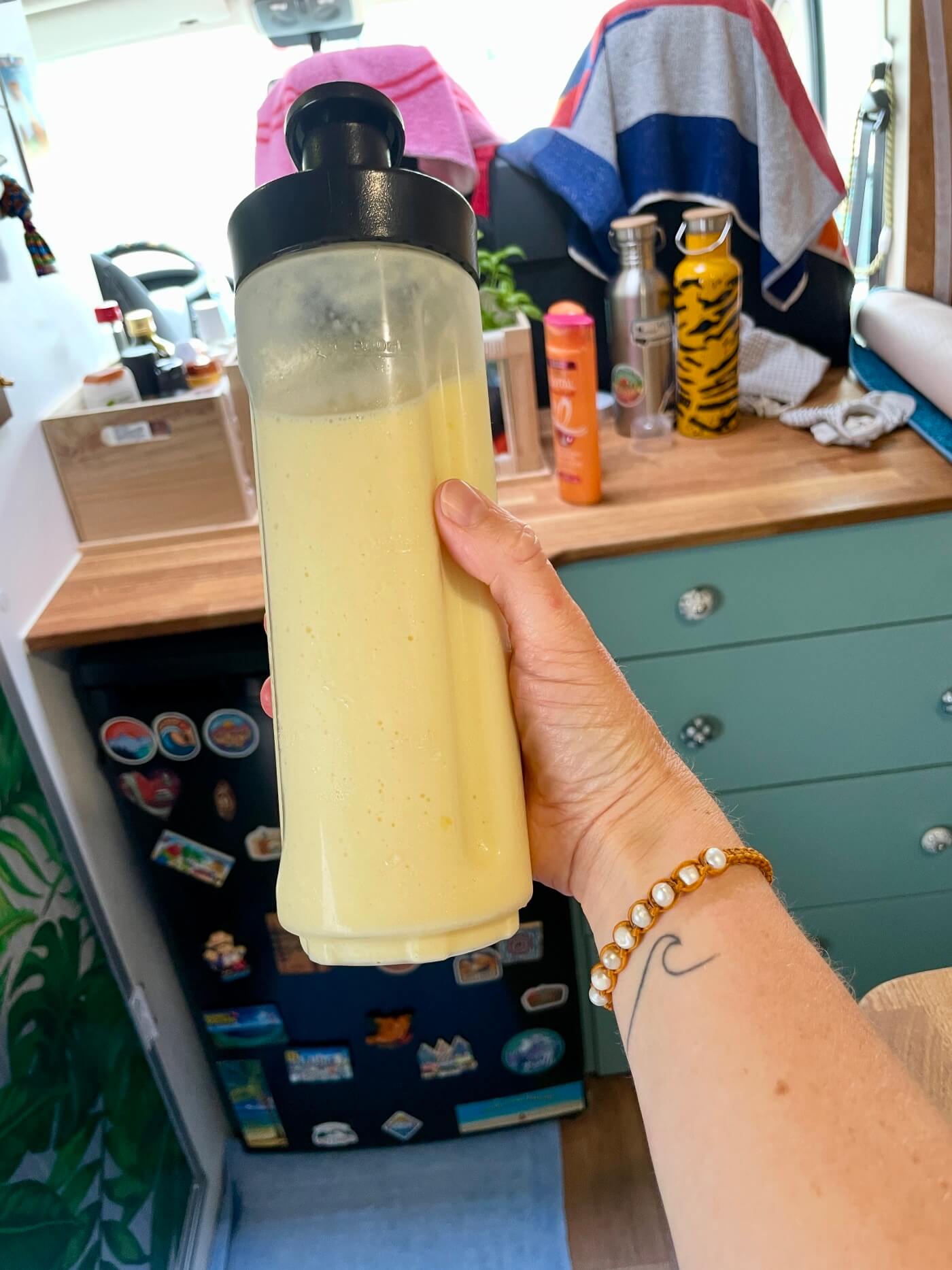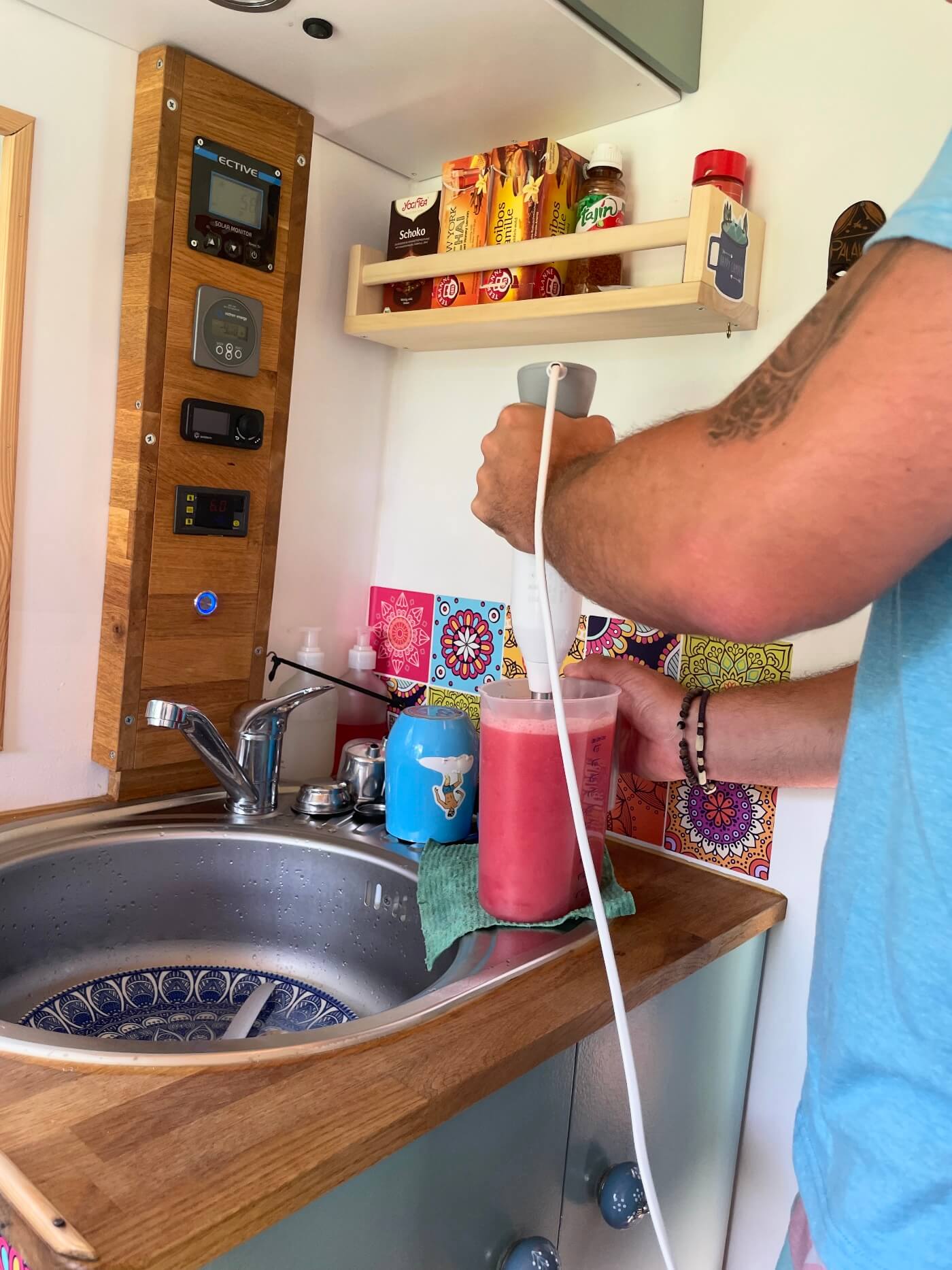 Schon seit Jahren haben wir in unserem Van einen Stabmixer* dabei. So können wir überall auf der Welt leckere Smoothies machen und auch für Suppen kommt der Mixer oft zum Einsatz. Dank des Spannungswandlers* können wir den 1000 Watt Stabmixer auch problemlos in unserem Van benutzen. Für uns ein super praktisches Gadget für den Camper!