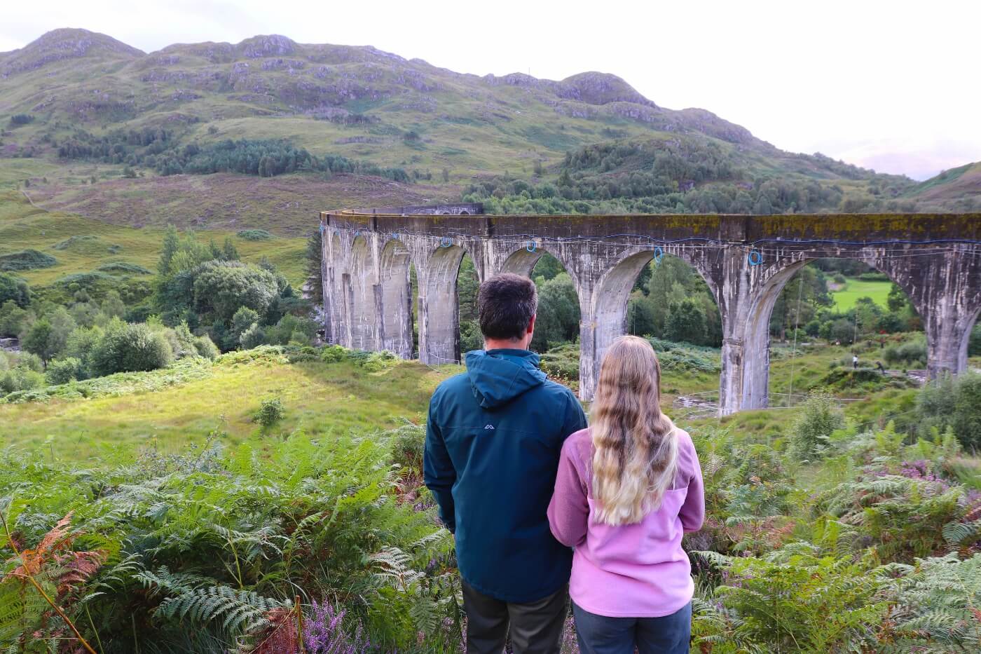 Es gibt zwei Aussichtspunkte, von wo aus man den Zug sehen kann. Der eine Aussichtspunkt ist ausgeschildert und macht vor allem bei den zwei Zugfahrten am Vormittag Sinn, da man den Zug dann von vorne sieht. Hier findest du den Fahrplan von dem Jacobite Steam. Der Zug passiert die Brücke ca. 45 Minuten nach der Abfahrt bzw. vor Ankunft in Fort William. Vom 01. Mai bis 29.September fährt der Zug zweimal täglich über das Viadukt Richtung Mallaig – einmal gegen 10:45 und einmal gegen 13:30 Uhr. Zu diesen Uhrzeiten kommt der Zug also auf dich zu, wenn du bei dem ausgeschilderten Aussichtspunkt stehst. Dann kann man von hier das beste Bild machen.