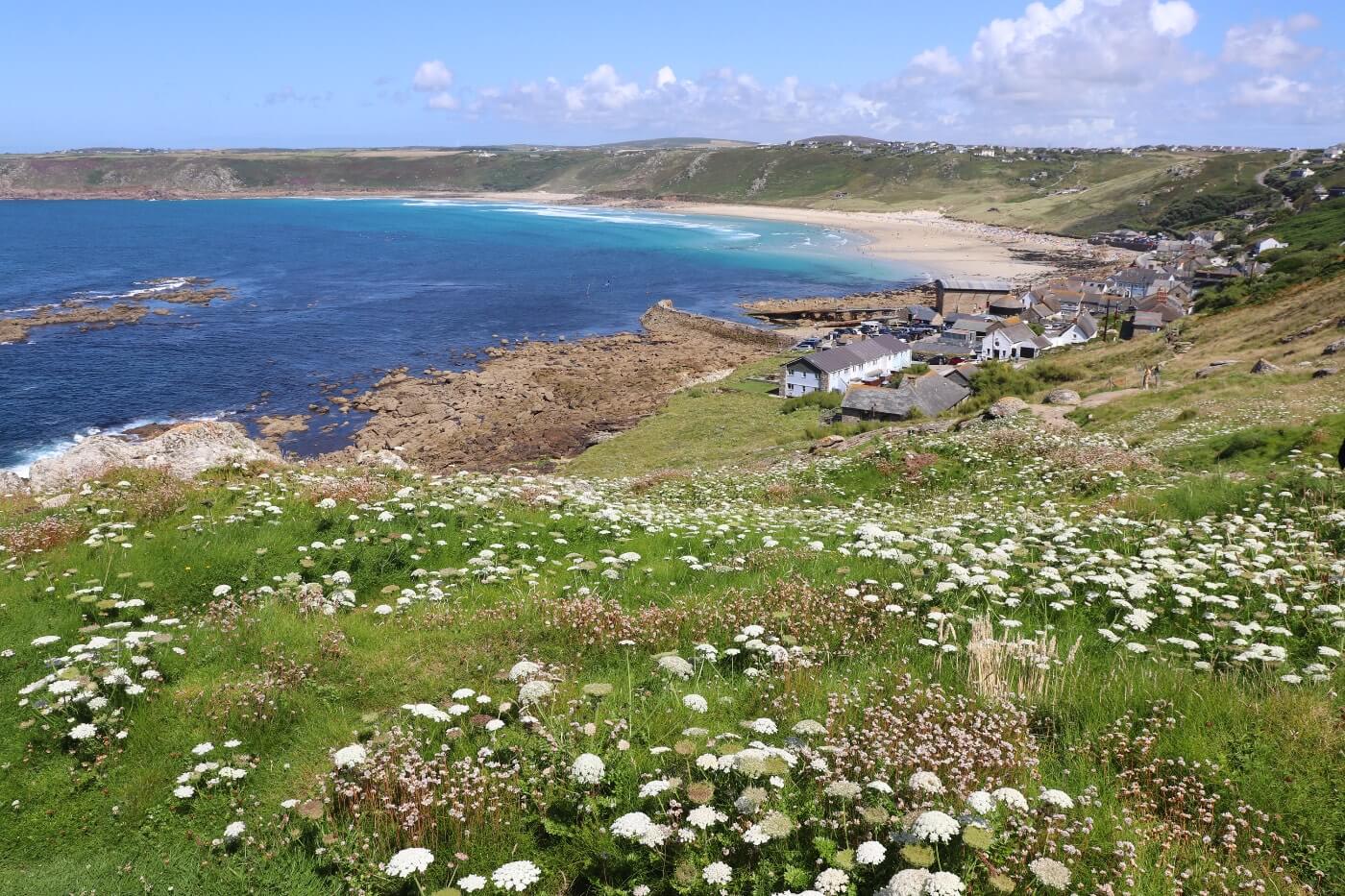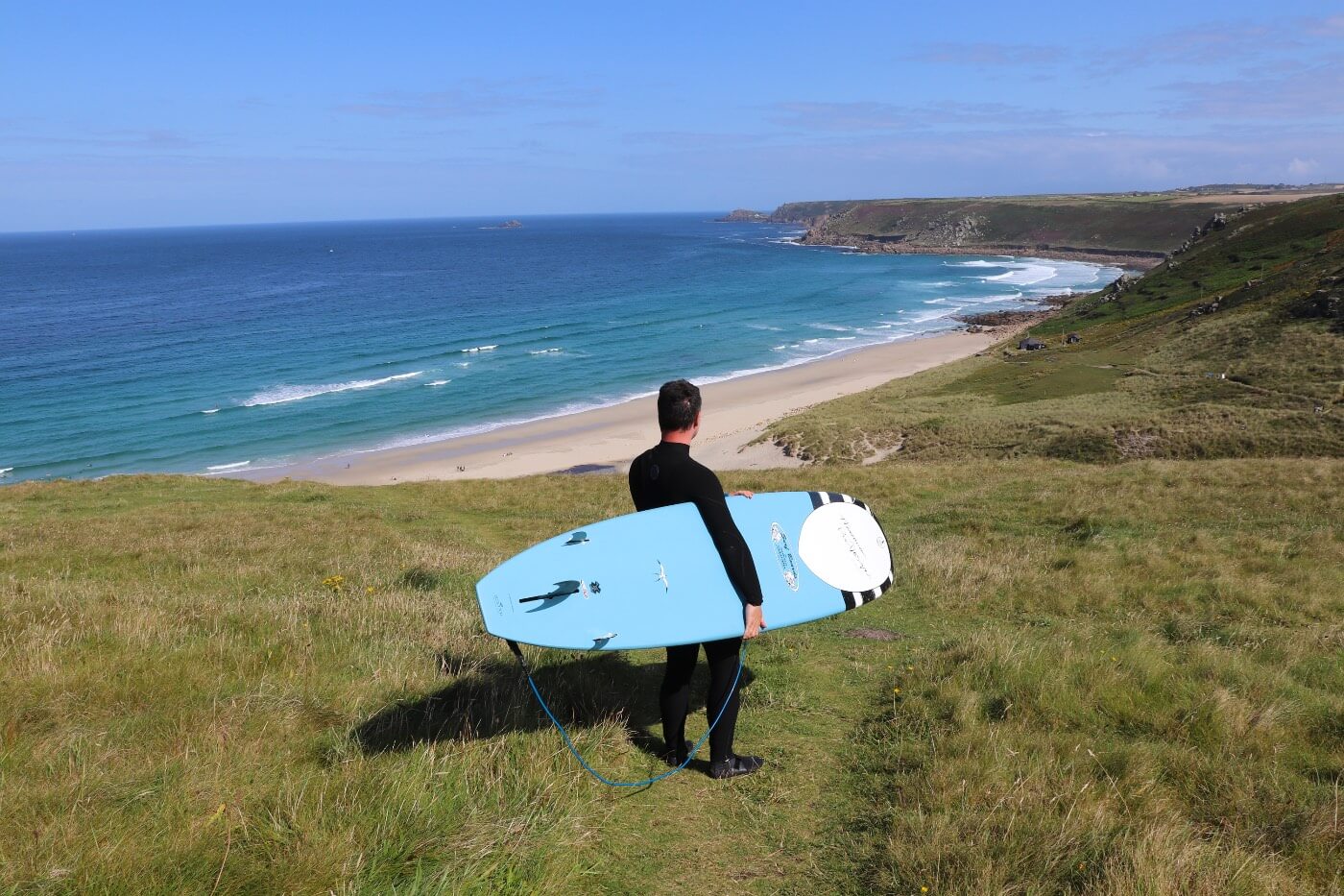 Sennen Cove ist ein wunderschöner Strand in Cornwall mit blauem Wasser und einem feinen Sandstrand. Für uns ist Sennen Cove der schönste Strand, den wir auf unserem Südengland Roadtrip mit dem Camper gesehen haben. Auf dem Hügel kann man für nur 5 Pfund den ganzen Tag parken, von wo aus man eine wunderschöne Aussicht auf die Bucht hat. Tobi geht am Strand surfen und danach gehen wir von hier zu Fuß den kleinen Wanderweg an der Küste entlang zum Land’s End, welches sich nur eine Bucht weiter befindet.