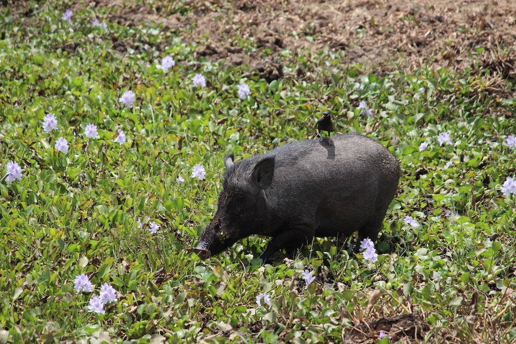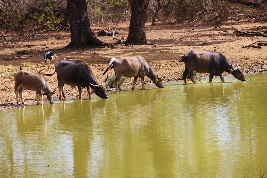 Nachdem wir bereits zwei Stunden unterwegs sind und an vielen „kleinen“ Tieren einfach vorbei gefahren sind, halten wir an einigen Wasserlöchern im Yala Nationalpark, wo sich immer viele Tiere zum Trinken aufhalten. Hier sehen wir unter anderem Krokodile, Wasserbüffel, Axis-Hirsche, Pfaue, Wildschweine und viele verschiedene Vogelarten.