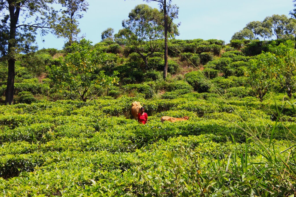 Wir fahren entlang an entlegenen Tee Plantagen und sehen aus der Ferne viele Frauen bei der Arbeit auf Teeplantagen. Zwischendurch geht es immer mal wieder durch Regenwald, vorbei an hohen Bergspitzen im Nebel.
