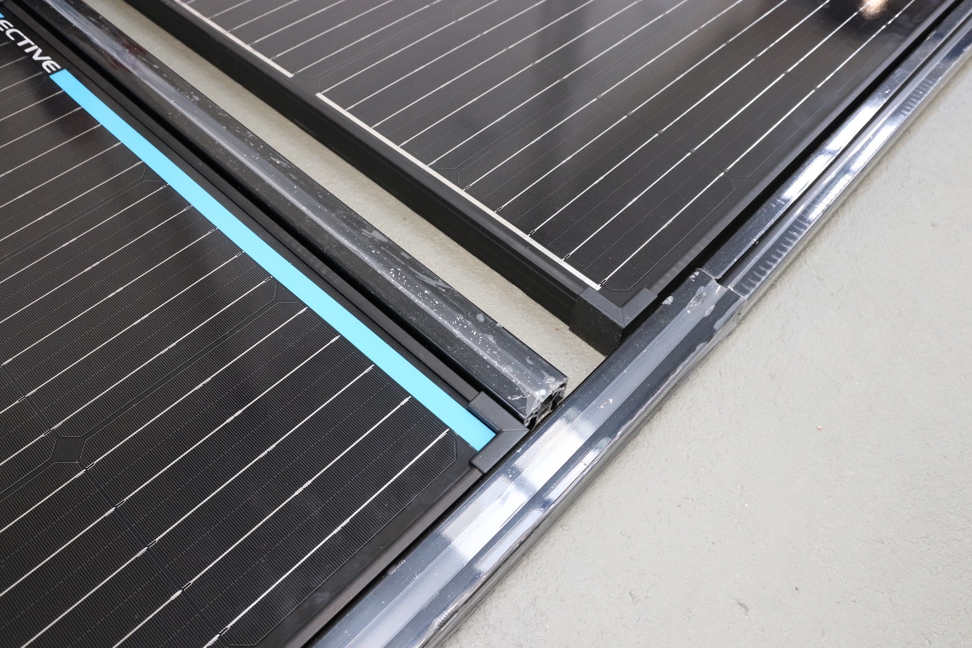 Um ein Solarmodul auf dem Dach zu verkleben benötigt man passende Montagefüße. Diese werden seitlich am Modul befestigt und dann aufs Dach geklebt. Zuerst muss dafür das Dach gereinigt werden. Wir benutzen dafür Isopropyl-Alkohol, da es keinen Film hinterlässst. Die Füße und die zu klebende Fläche auf dem Dach sollten nun mit etwas Schleifpapier angerauht und mit einem geeigneten Primer, passend zum Kleber, behandelt werden. Unsere Wahl zum Kleben ist meistens Sikaflex 252i. Nun wird der Montagekleber auf den Montagefüßen und dem Dach aufgetragen und das Modul kann verklebt werden. Danach sollte es zumindest über Nacht trocknen gelassen werden und am nächsten Tag auf Festigkeit kontrolliert werden.