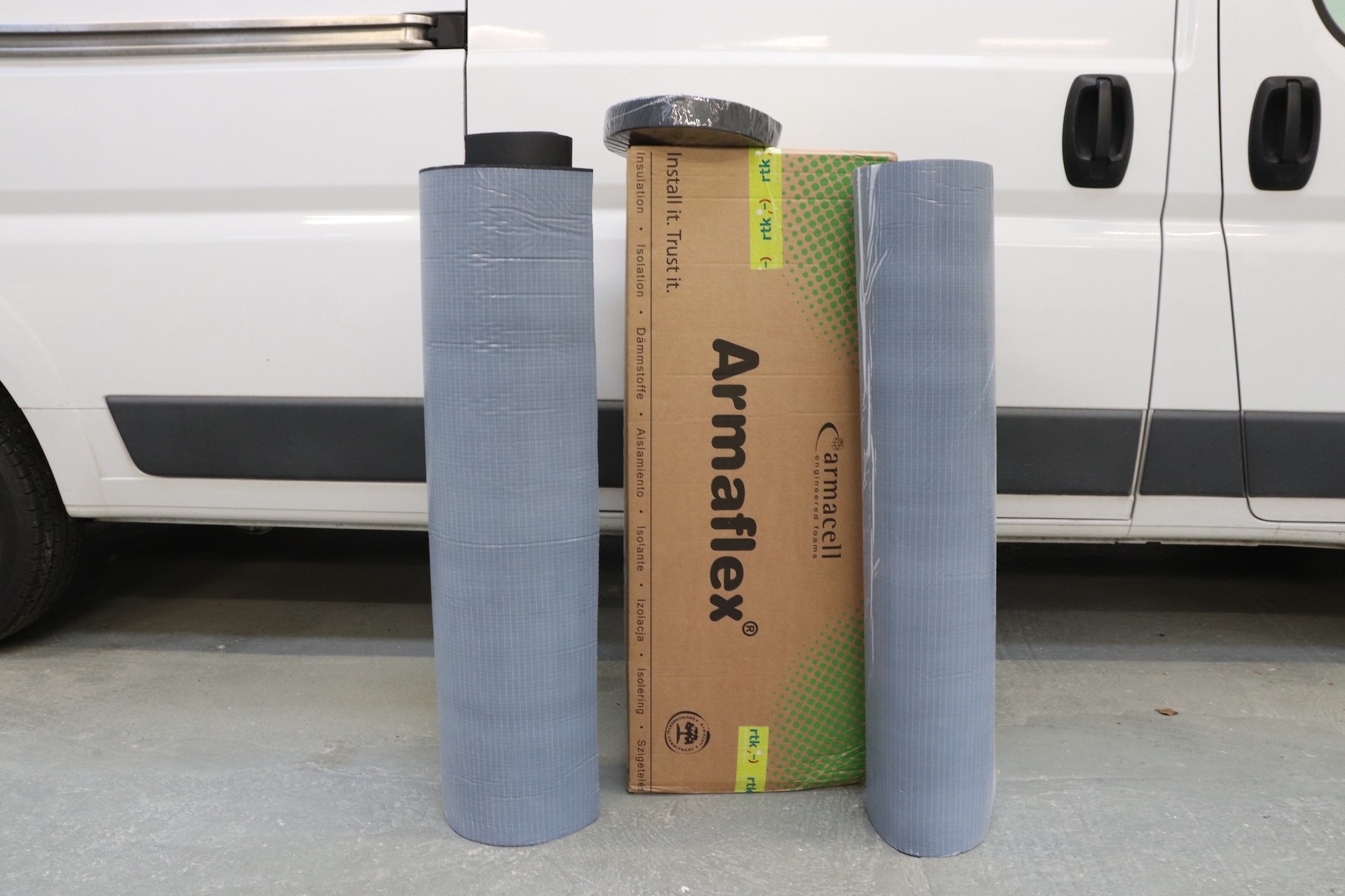 Armaflex* ist ein Kautschukmaterial und bei Van Ausbauern sehr beliebt. Der Hersteller wirbt mit der Eigenschaft der Tauwasserverhinderung und der leichten Verarbeitung. Armaflex hat eine niedrige Wärmeleitfähigkeit, nimmt keine Feuchtigkeit auf und ist schwer entflammbar. Außerdem ist die Verarbeitung sehr einfach. Es ist nämlich selbstklebend und lässt sich durch die hohe Flexibilität auch gut an einer runden Karosserie anbringen.