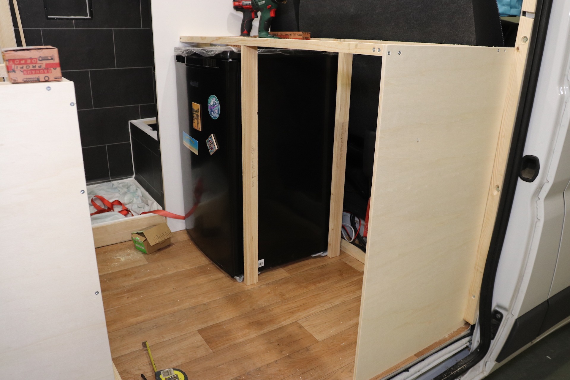Nun kann es endlich mit dem Möbelbau losgehen. Dieser Teil macht unserer Meinung nach am meisten Spaß. Bevor man anfängt sollte man natürlich genau wissen, wo welche Möbel stehen sollen und auch die Hängeschränke müssen geplant werden. Zuerst haben wir unser Bett und die Sitzecke gebaut. Danach bauen wir unsere Nasszelle und anschließend die Küchenzeilen. Die Hängeschränke bauen wir zum Schluss.