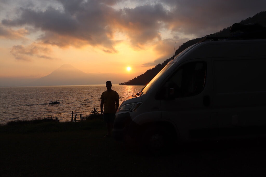 Abends genießen wir von unserem Campingplatz einen schönen Sonnenuntergang über den Lake Atitlan mit den drei Vulkanen im Hintergrund.