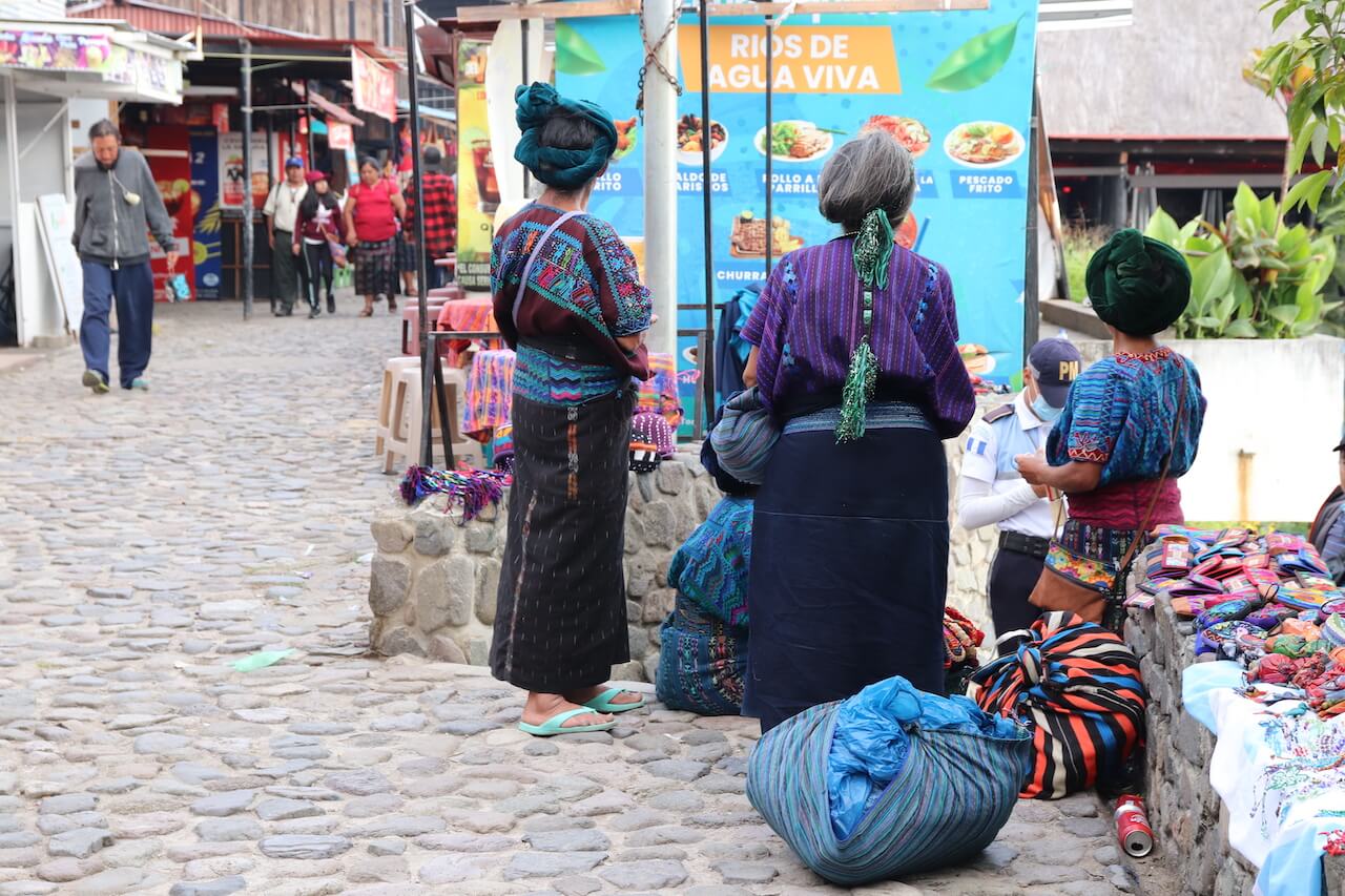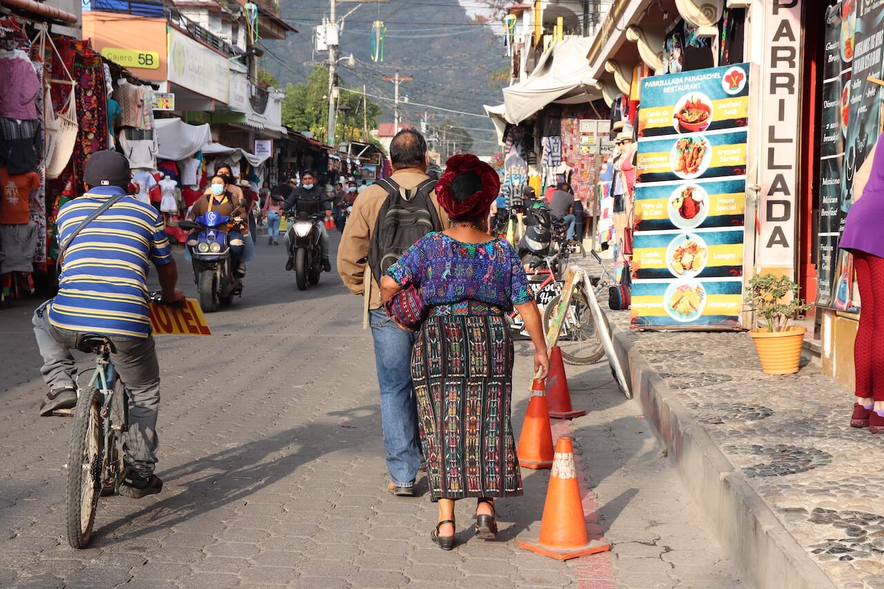 Wir können uns gar nicht satt sehen, alles ist so schön bunt. Erstaunlich viele Frauen tragen die traditionellen Maya Klamotten. Lange Röcke, Kleider, Umhänge und Kopfschmuck in tollen Mustern und Farben.