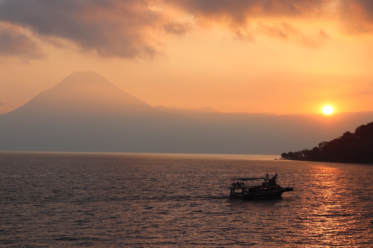 Abends genießen wir von unserem Campingplatz einen schönen Sonnenuntergang über den Lake Atitlan mit den drei Vulkanen im Hintergrund.