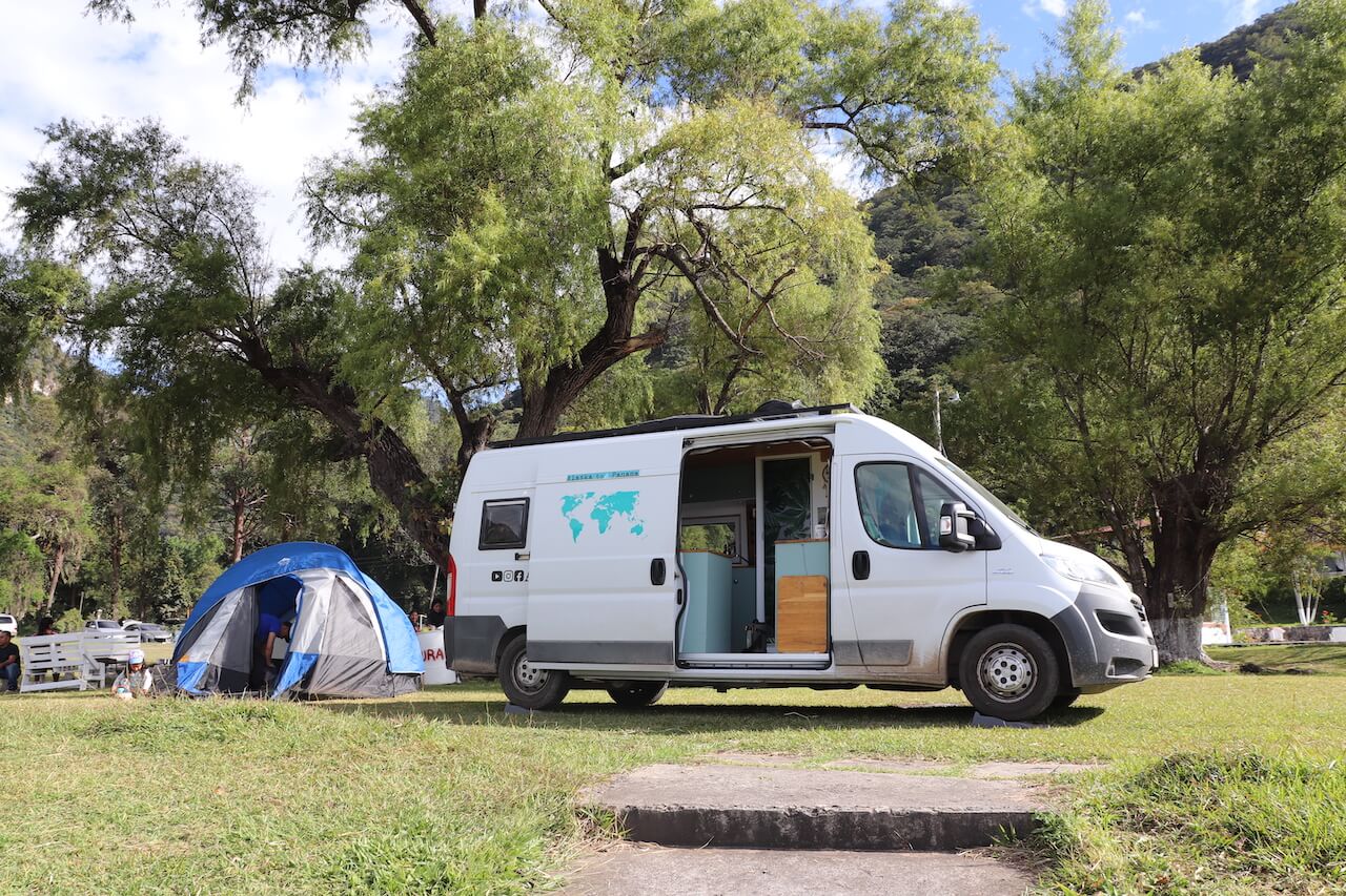 Campingplätze gibt es in Guatemala eigentlich gar nicht mehr und es ist zur Zeit schwierig einen guten Schlafplatz zu finden. Alternativen sind Tankstellen, öffentliche Plätze oder Hotelparkplätze. Freistehen wie noch in den USA ist hier oft kaum möglich, da es abseits der Hauptstraße einfach keine Straßen gibt, überall sind Grundstücke. Wir übernachten auf einer Wiese, die zu einem kostenpflichtigen Park mit Spazierwegen und Spielplatz gehört. Um unser Auto laufen viele Kinder herum, bis um 17 Uhr der Chicken Bus alle Besucher nach Hause fährt und Ruhe eintritt.