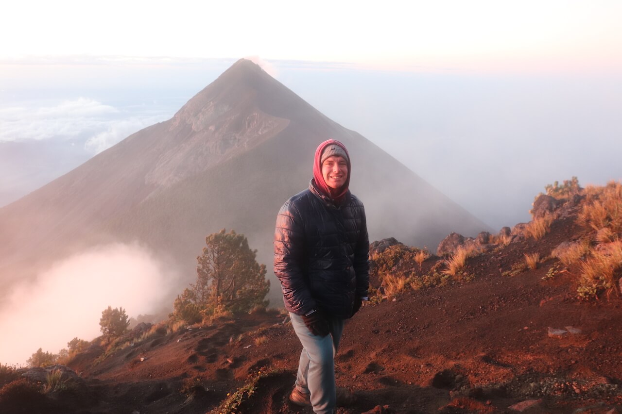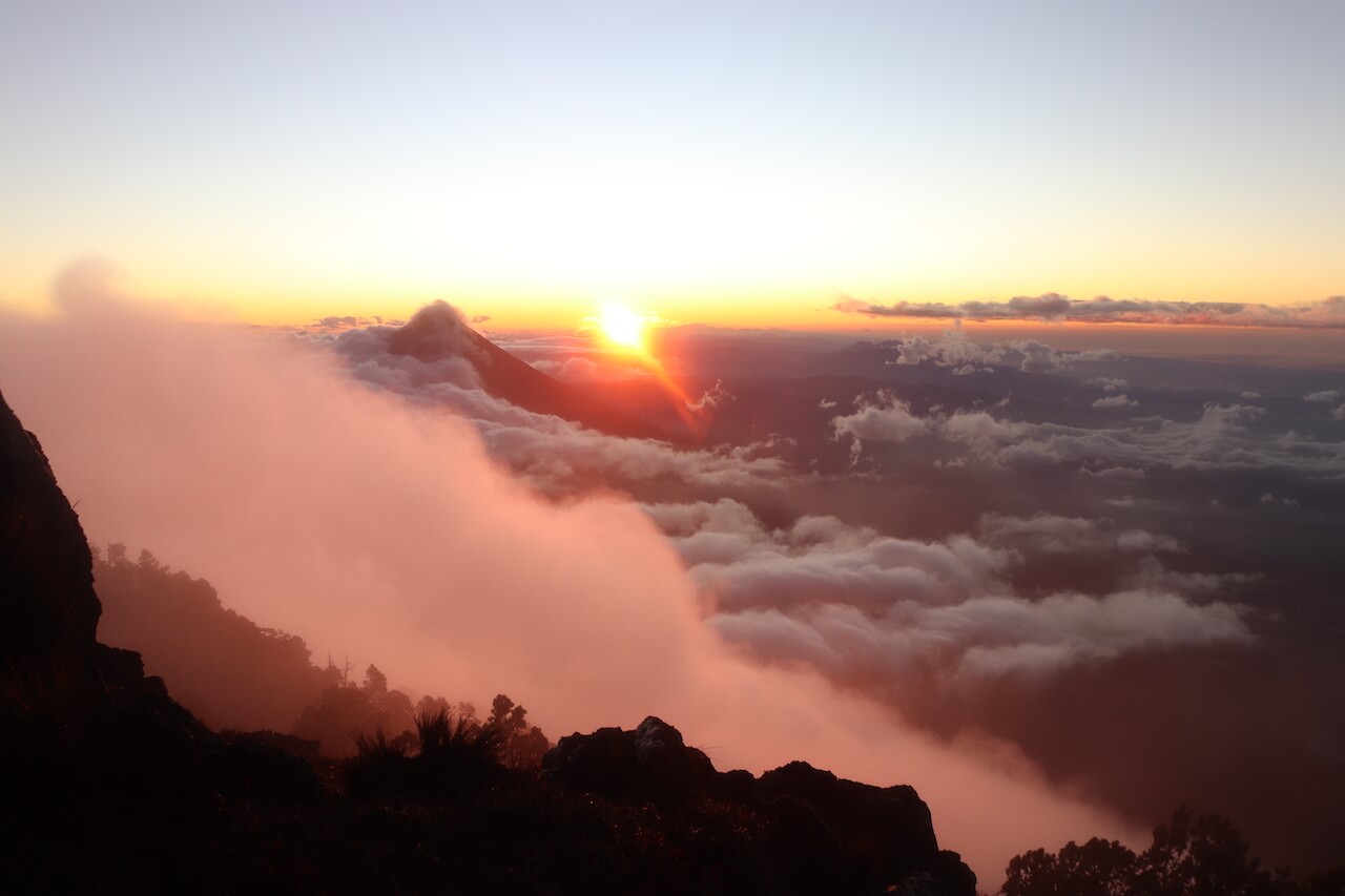 Wind und Wolken durchnässen unsere Klamotten, der Wind wird immer stürmischer und unser Guide teilt uns bald mit, dass wir umdrehen müssen. So gehen wir ein Stück zurück wo es immerhin ein bisschen weniger windig ist und bewundern den Sonnenaufgang. Der Fuego Vulkan ist sogar frei von Wolken und lässt noch eine Rauchwolke frei.