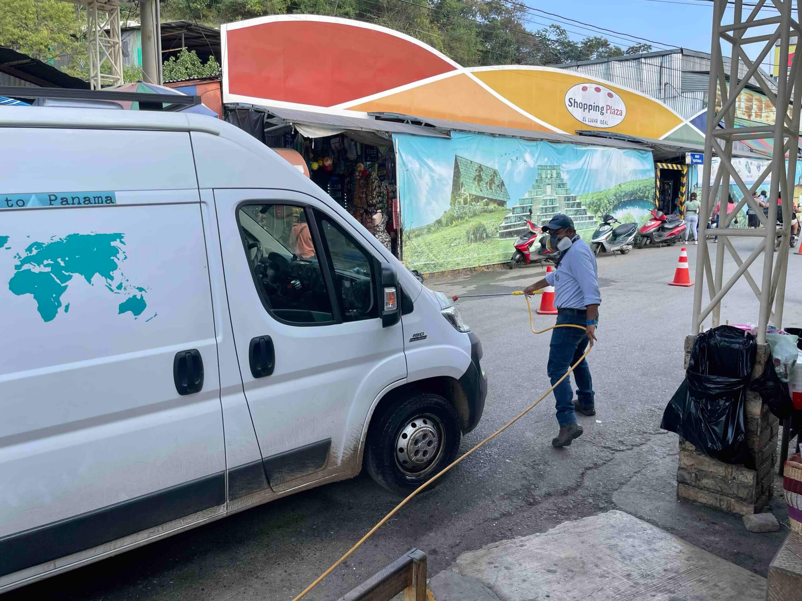 Bei der Grenze angekommen wird als erstes unser Auto gegen eine Gebühr von 6€ desinfiziert und wir stornieren die temporäre mexikanische Importgenehmigung für unser Auto. Dann bekommen wir unsere Reisepässe gestempelt und wir kümmern uns um die temporäre Importgenehmigung für Guatemala. Der Grenzübergang ist nicht groß und wir sind scheinbar die einzigen, die die Grenze mit dem Auto überqueren. Bei den meisten handelt es sich um Fußgänger, die hier zum Einkaufen hinkommen.