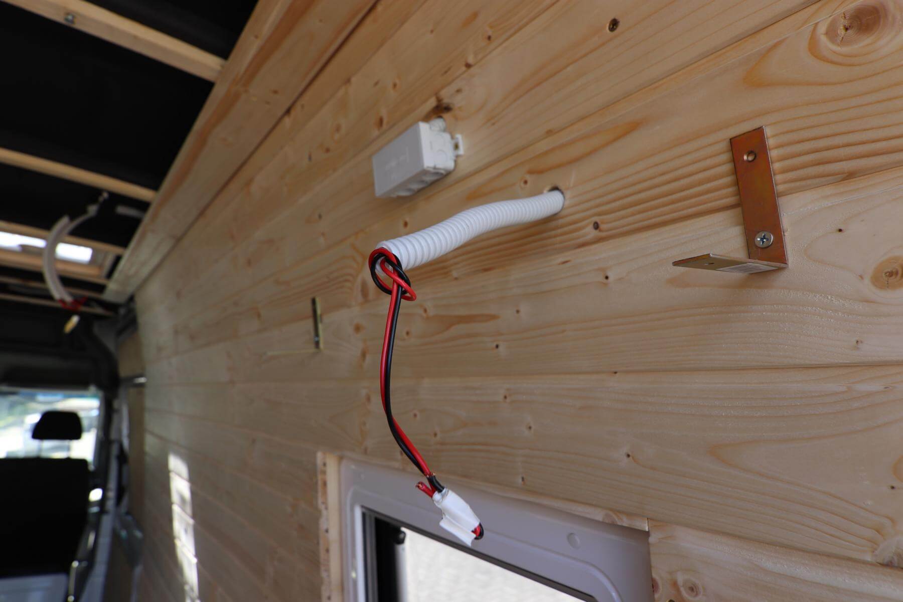 Nachdem unsere Unterkonstruktion an den Wänden, oder besser gesagt auf den Holmen war, ging es mit der Camper Elektrik weiter. Die muss nämlich unter die Wandverkleidung. Wir mussten uns also schon im Voraus überlegen, an welchen Stellen wir welche Lampen einbauen möchten. Wir haben uns für zwei hell-weiße LED Leuchten sowie für sechs LED Leuchten in einem warm-gelben Licht entschieden. Außerdem möchten wir zwei USB Ladestationen neben dem Bett einrichten, wo wir unsere Handys laden können oder eine USB-Lichterkette anschließen können.