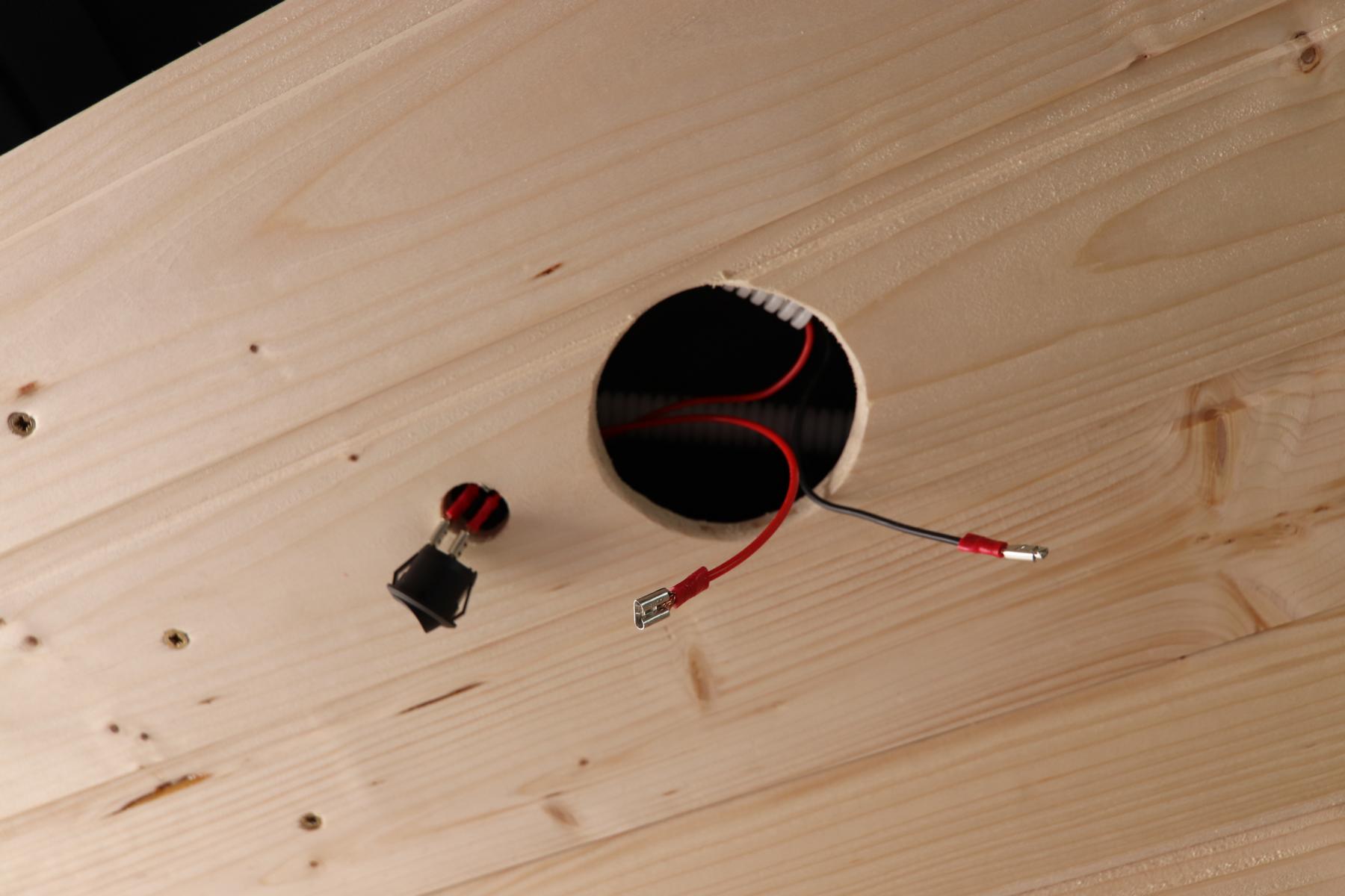 An den Stellen, wo unsere Beleuchtung hinkommt, haben wir mit einem ein passendes Loch in ein Brett gebohrt und dort die Leuchte eingesetzt. Einige Lampen kommen bei uns unter die Hängeschranke. Dort haben wir dann ein Loch in die Wandverkleidung gebohrt, wo die Kabel durchpassen und später können wie sie dann einsetzen.