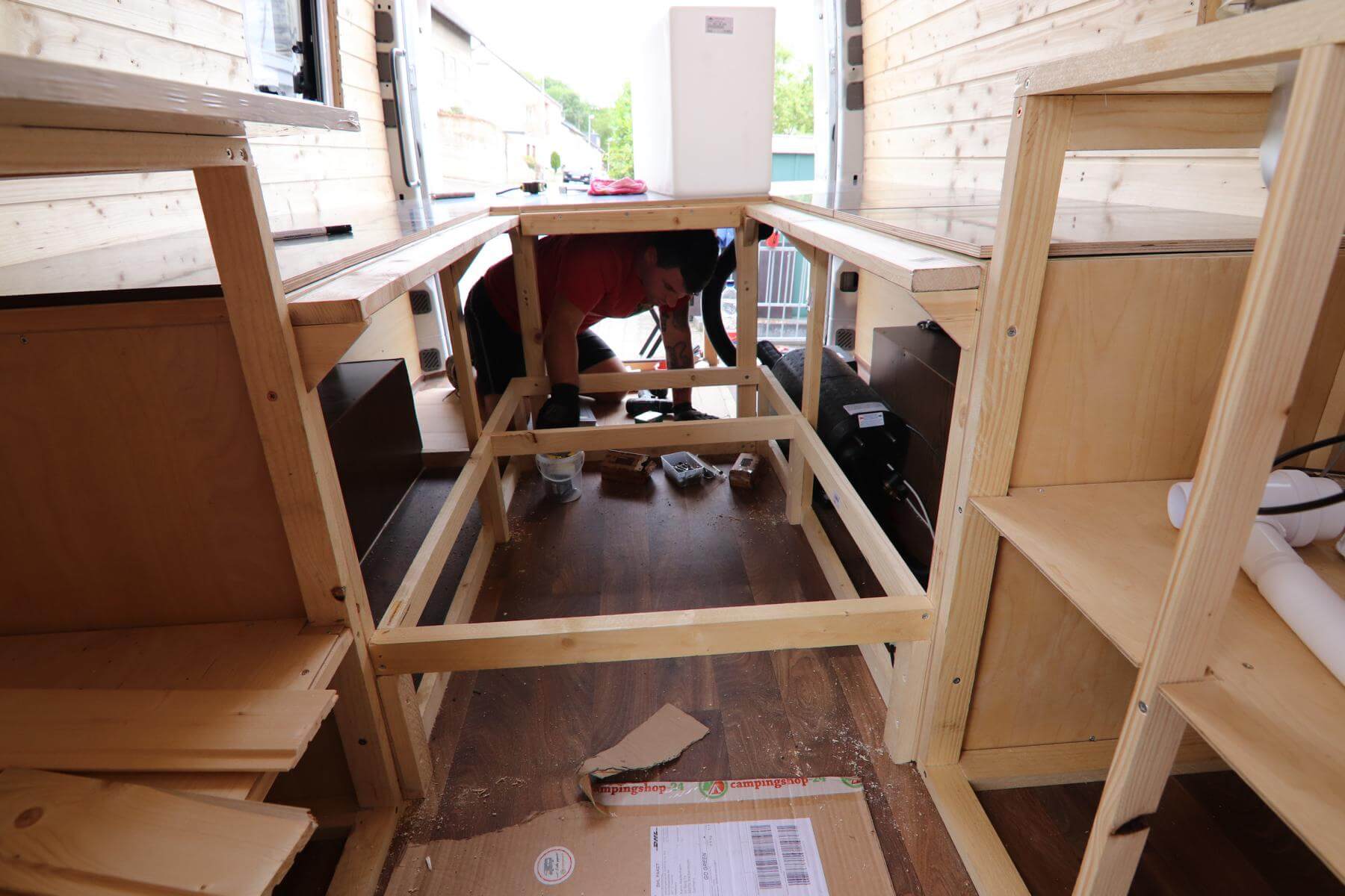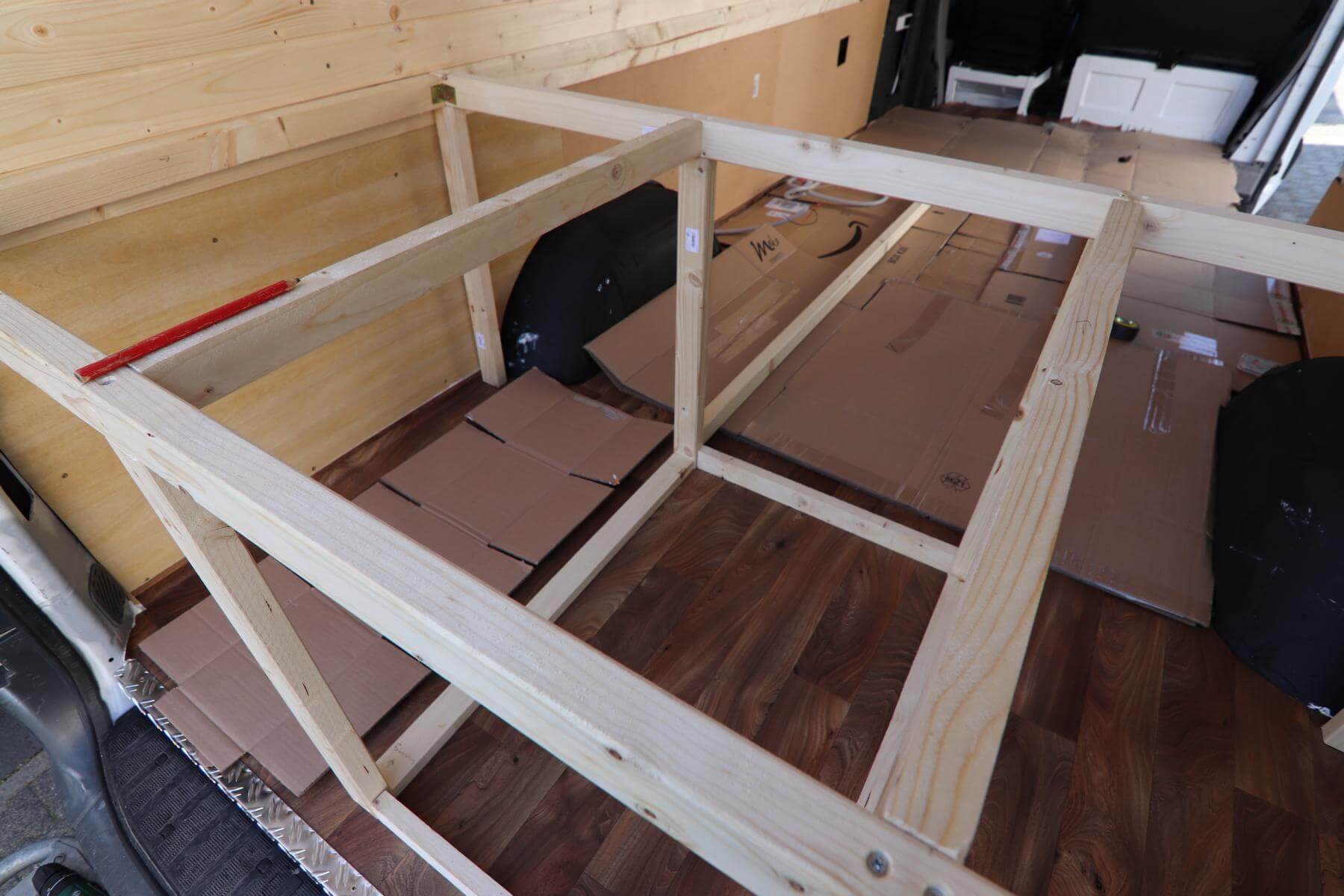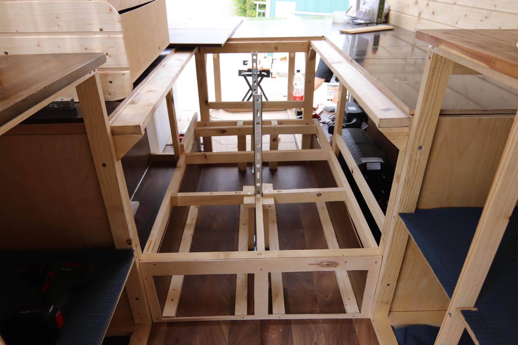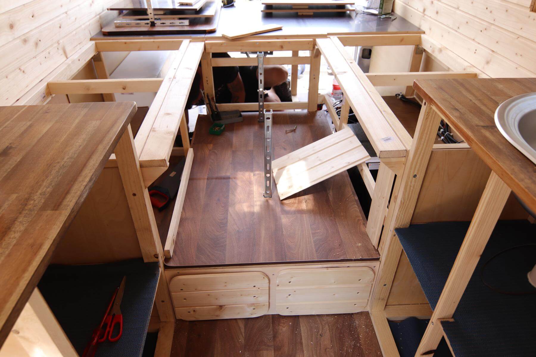 Das Grundgerüst vom Bett und der Sitzecke im Campervan