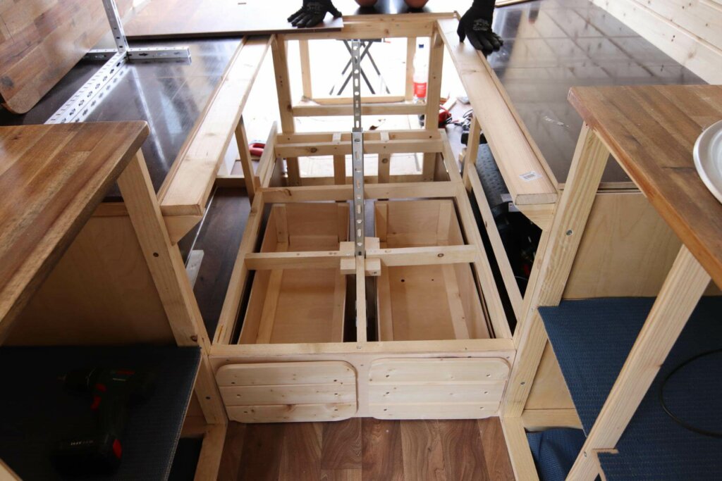 Um den neuen Hubtisch einzubauen, müssen wir natürlich erst einmal unseren alten lösen. Für zusätzlichen Stauraum haben wir unter dem Podest zwei Schubladen verbaut. Den oberen Teil des Tisches können wir einfach aus der Verankerung lösen. Danach müssen wir aber erstmal die Seitenverkleidung aus Profilholz sowie die Auflageflächen von unserer Sitzecke entfernen. Anschließend können wir die Bodenplatte vom Podest herausheben und dann unsere alte Verankerung am originalen Boden lösen.