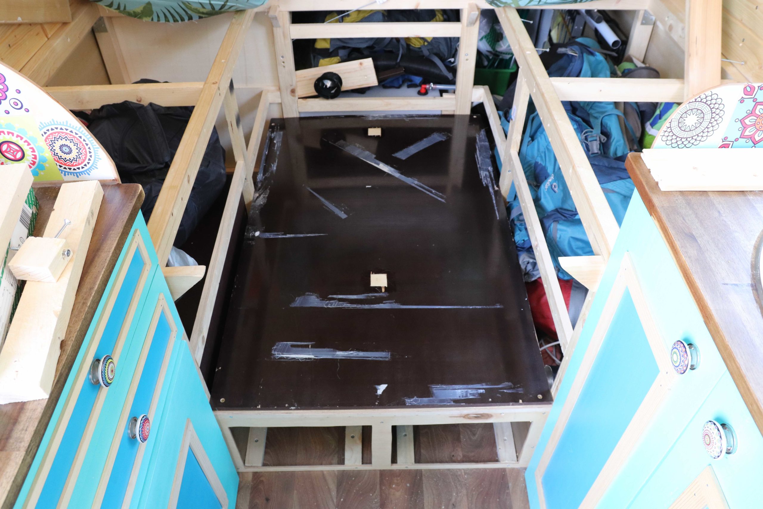 - 12mm Siebdruckplatte als Bettplatte – mittlerweile würden wir aber Birke Multiplex empfehlen