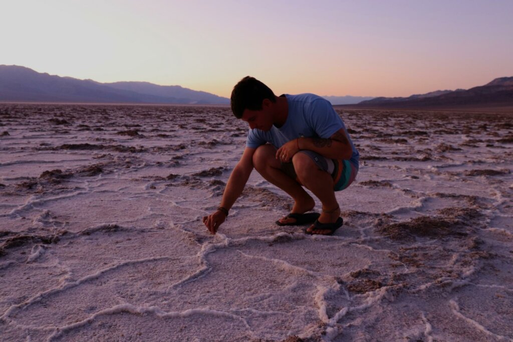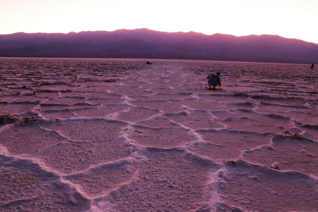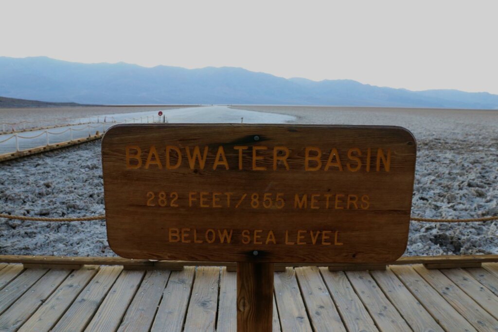 Am Visitor Center beschließen wir kurzfristig noch schnell zu dem Badwater Basin zu fahren. Das Badwater Basin ist der tiefste Punkt der USA und befindet sich mit einer Höhe von 85,5 Metern unter dem Meeresspiegel. Vor 3000 Jahren war hier noch ein tiefer See, heute findet man hier eine Salzwüste mit interessanten Strukturen auf dem Boden.